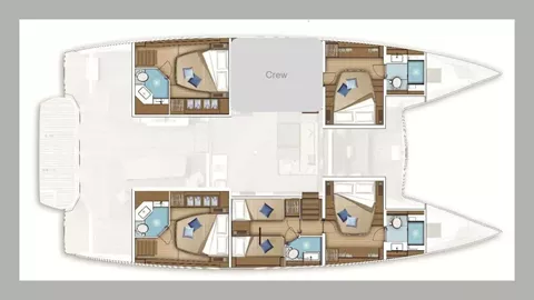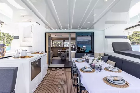 The Flybridge with a full bar and extra dining area provides an elevated, spacious, and luxurious setting for socializing and dining, offering panoramic views and enhancing the overall sailing experience.