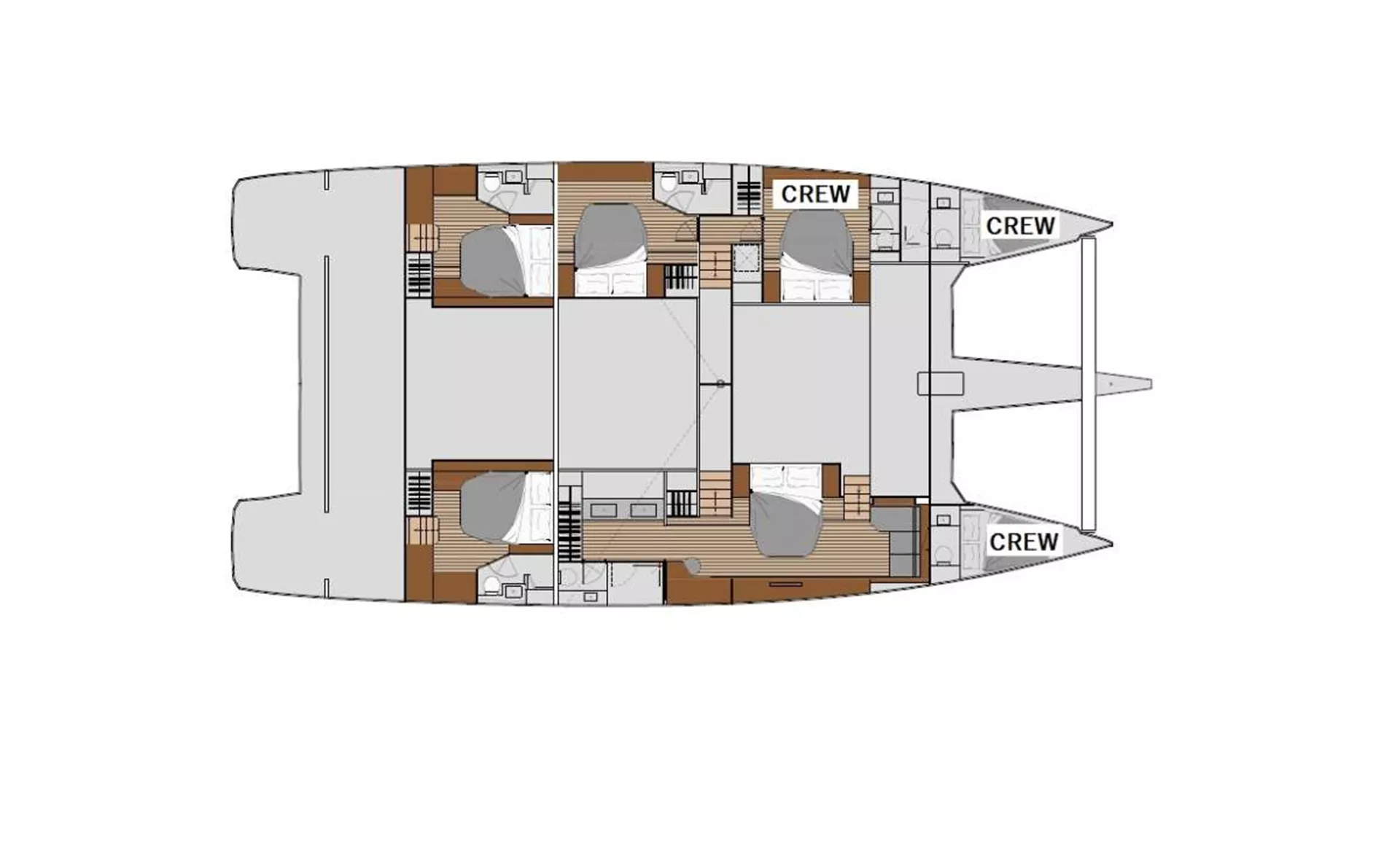 FLORAMYE has four cabins, one exceptional master suite as well as three double cabins. All cabins are equipped with queen sized beds and their own ensuite bathrooms. FLORAMYE also offers spacious living space with a large saloon with a galley and indoor and outdoor dining areas.