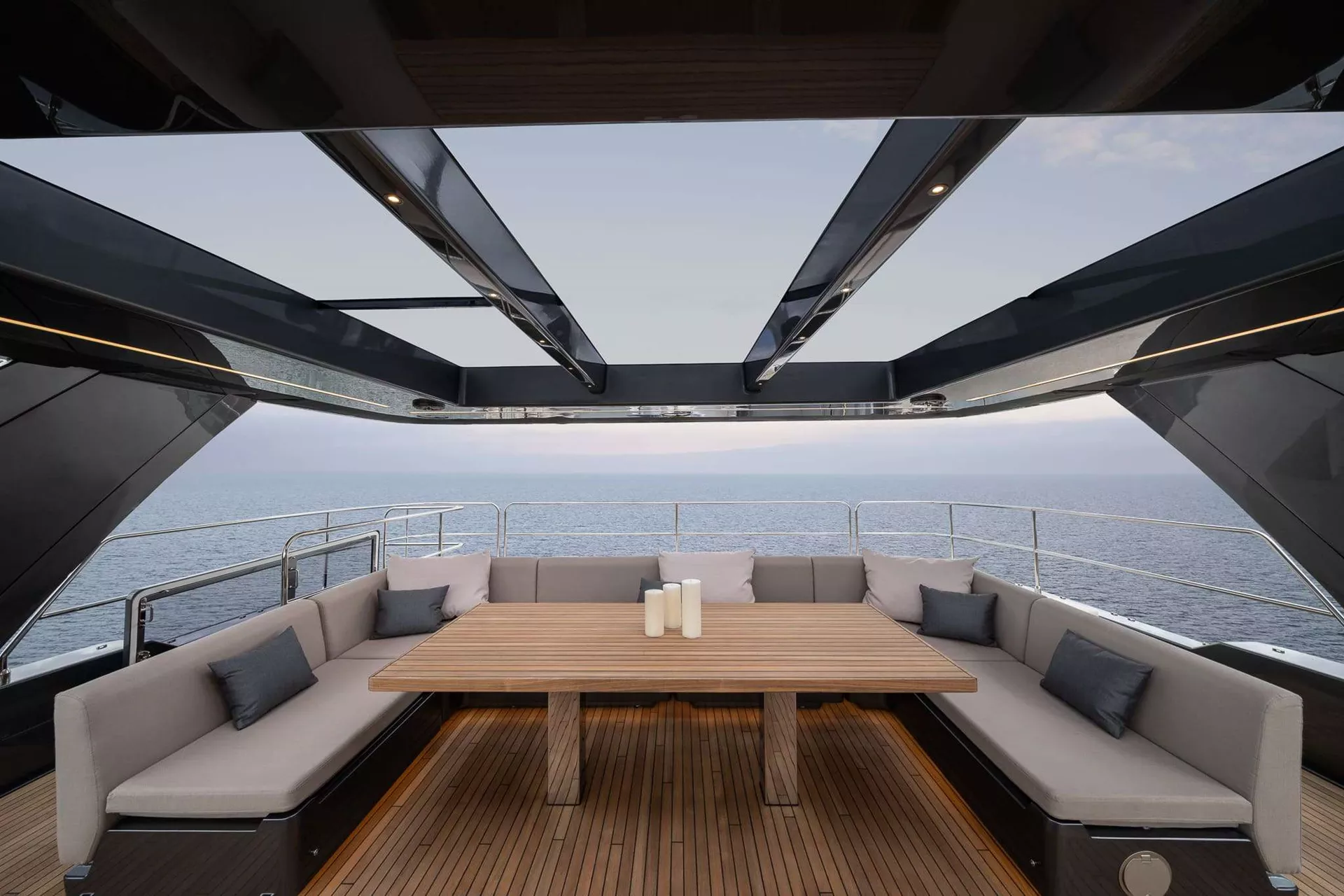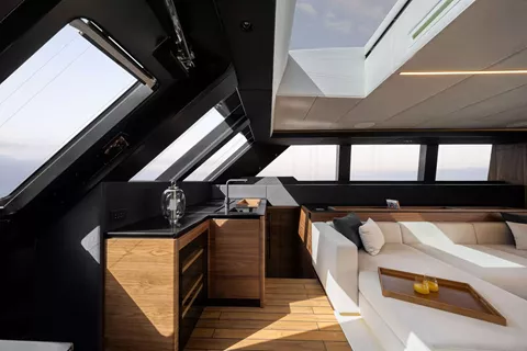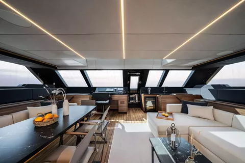 The yacht's interiors exude contemporary elegance, featuring refined decor, designer furniture, and light natural fabrics. Panoramic glazing in the main salon floods the space with natural light, enhancing the feeling of openness and connection with the surrounding seascape.