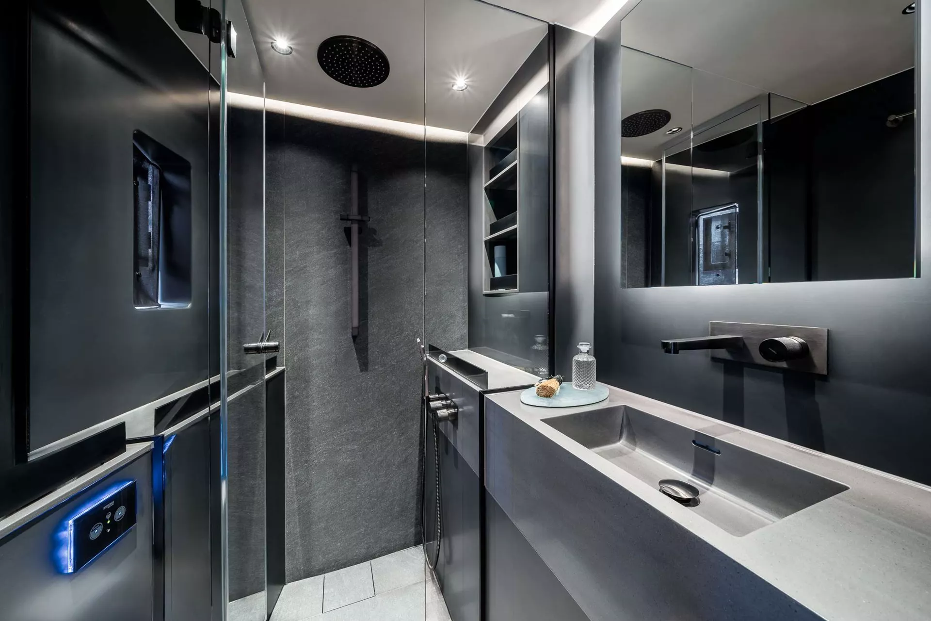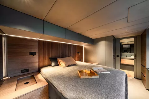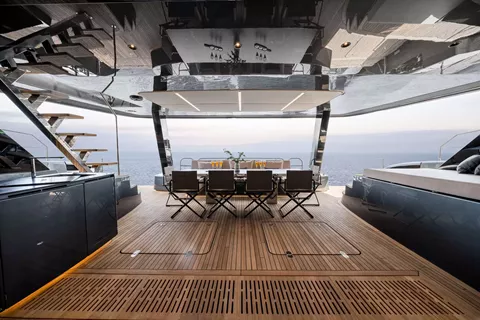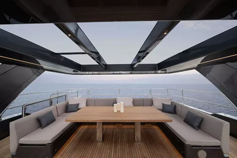 Outdoor living is a true highlight aboard Double Happiness. The full-beam aft cockpit presents a fantastic alfresco dining area with breathtaking ocean views, complemented by a daybed, bar, and a hydraulic platform perfect for sunbathing and easy access to water activities. A serene bow terrace and a well-equipped flybridge with modular seating and barbecue complete the outdoor spaces, perfect for entertaining and relaxation.