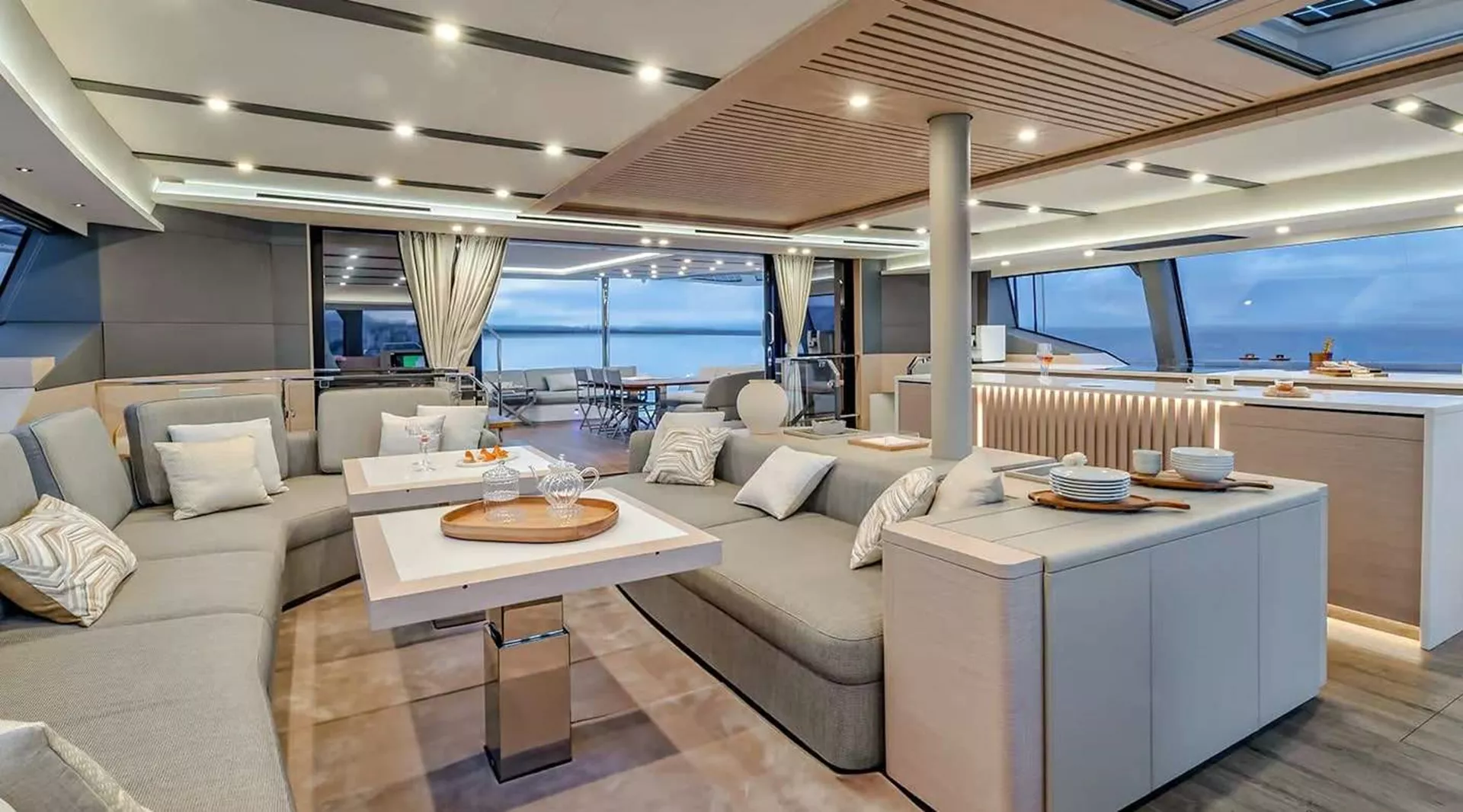 The Thíra 80’s social and leisure areas are nothing short of breathtaking. The revolutionary addition of two side deck lounges with retractable balconies transforms the yachting experience, offering guests the sensation of sailing on a private cruise ship. These balconies create a seamless connection to the sea, inviting natural light and ocean breezes into the living spaces, and providing unparalleled views of the surrounding seascape. It’s a design touch that evokes the glamour and sophistication of a superyacht, while maintaining the intimacy and exclusivity of a private catamaran.