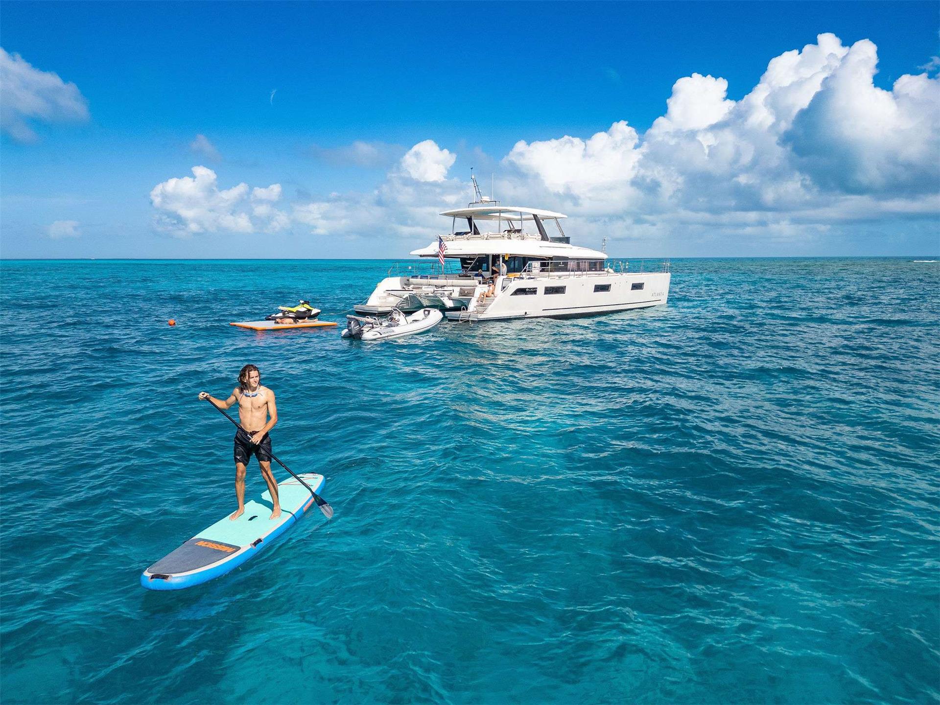 Introducing Atlantia, a stunning 63’ power catamaran with an impressive 33-foot beam. Designed for both luxury and performance, Atlantia offers five beautifully appointed staterooms, each with its own en-suite bathroom, plus dedicated crew quarters. She comfortably accommodates up to 10 guests overnight, ensuring an unforgettable experience on the water.
