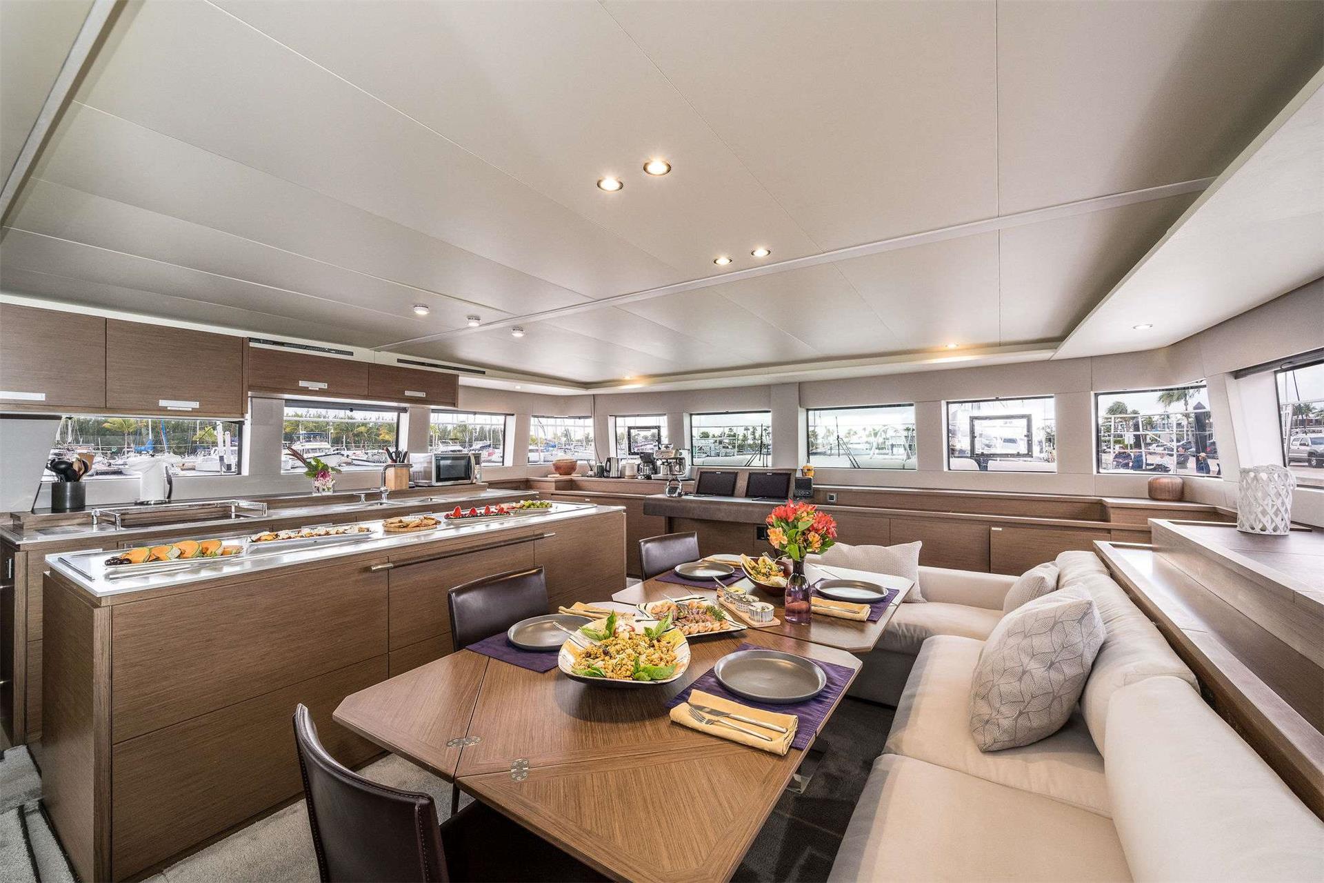 This exceptional yacht delivers a smooth and stable ride, making every journey as relaxing as it is exhilarating. Inside, the spacious, fully equipped galley is a chef’s dream, featuring a large island, an industrial-grade dishwasher, a newly enhanced hood over a full-sized range and oven, and a double-bay sink. The salon is equally inviting, boasting a large retractable TV, a stylish lounge and dining area with two convertible tables, and an unparalleled level of comfort.
