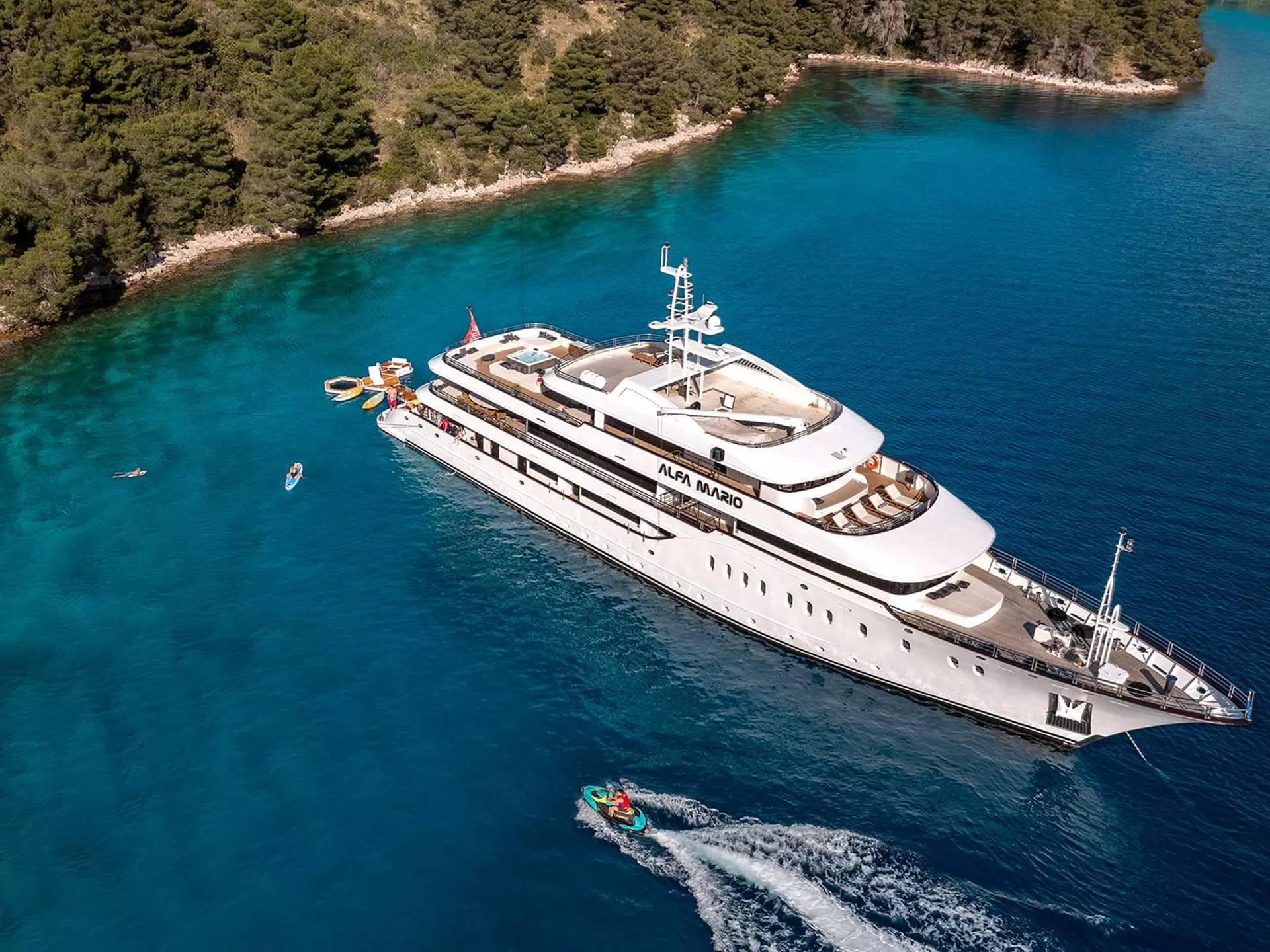 Alfa Mario carries two of the most popular recreational watercraft aboard - a jet ski and a sea bob. In addition, there are two kayaks, two paddleboards, and the banana ride.