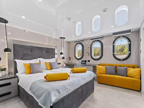 Master cabin with double bed. Private bathroom with shower box and home-type toilet.