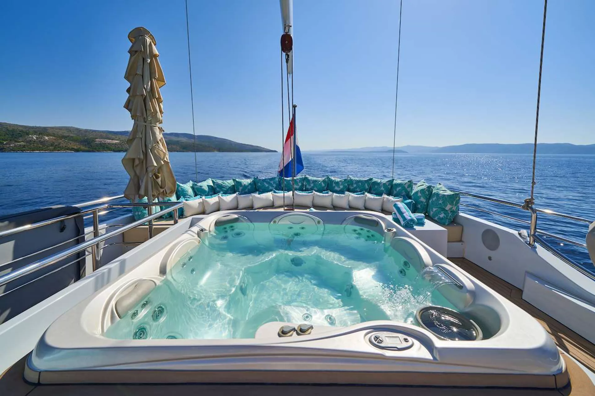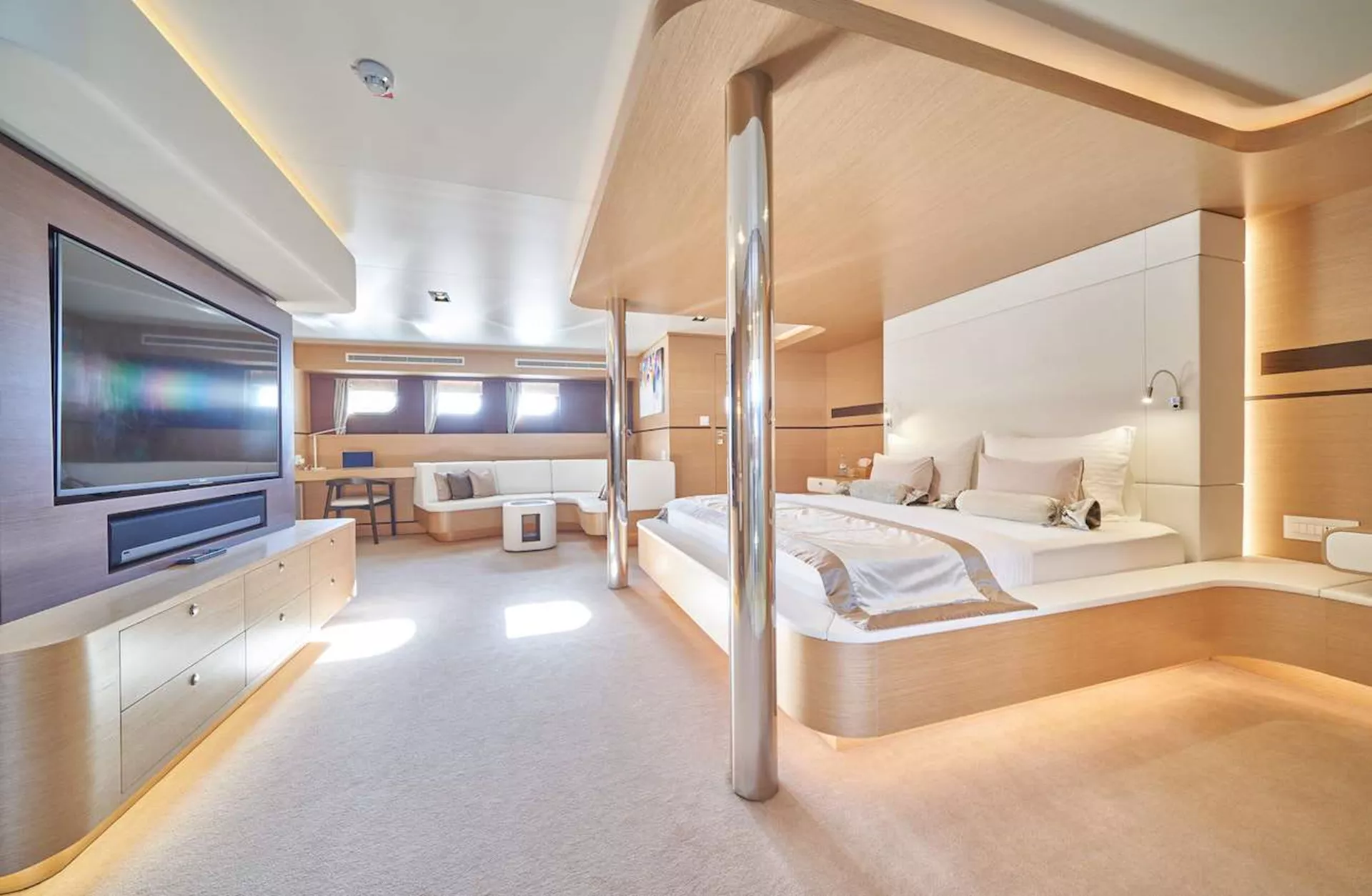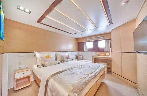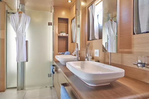 OMNIA sleeps up to 12 guests in 6 staterooms. These are comprised of a massive master suite, a VIP, 2 queens and 2 twin staterooms that can be converted into queens. All staterooms have ensuites and are equipped with a large flat screen television, satellite and local antenna, wifi, interphone, safe box, HVAC control and surroundsound system.