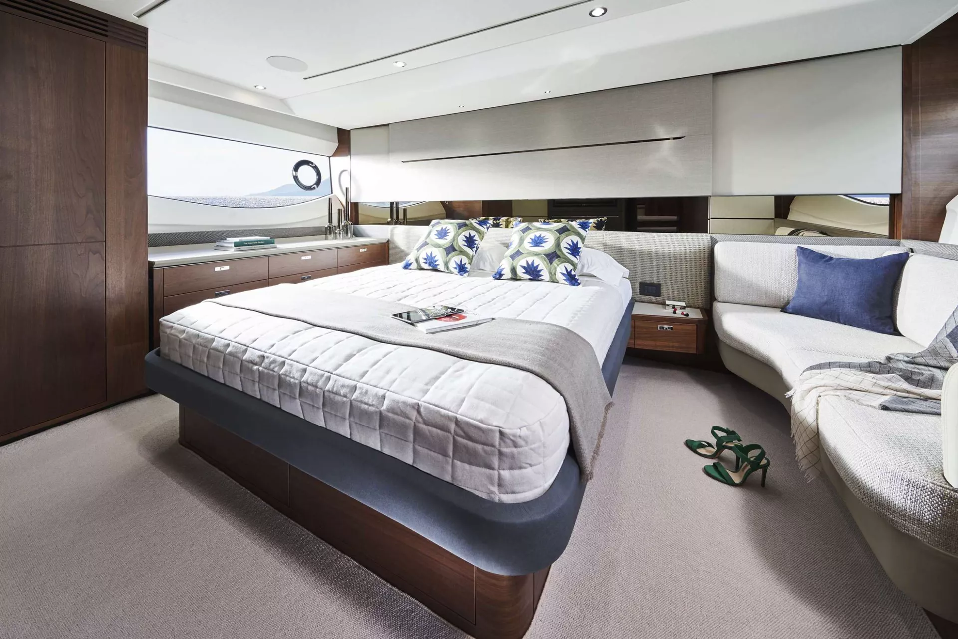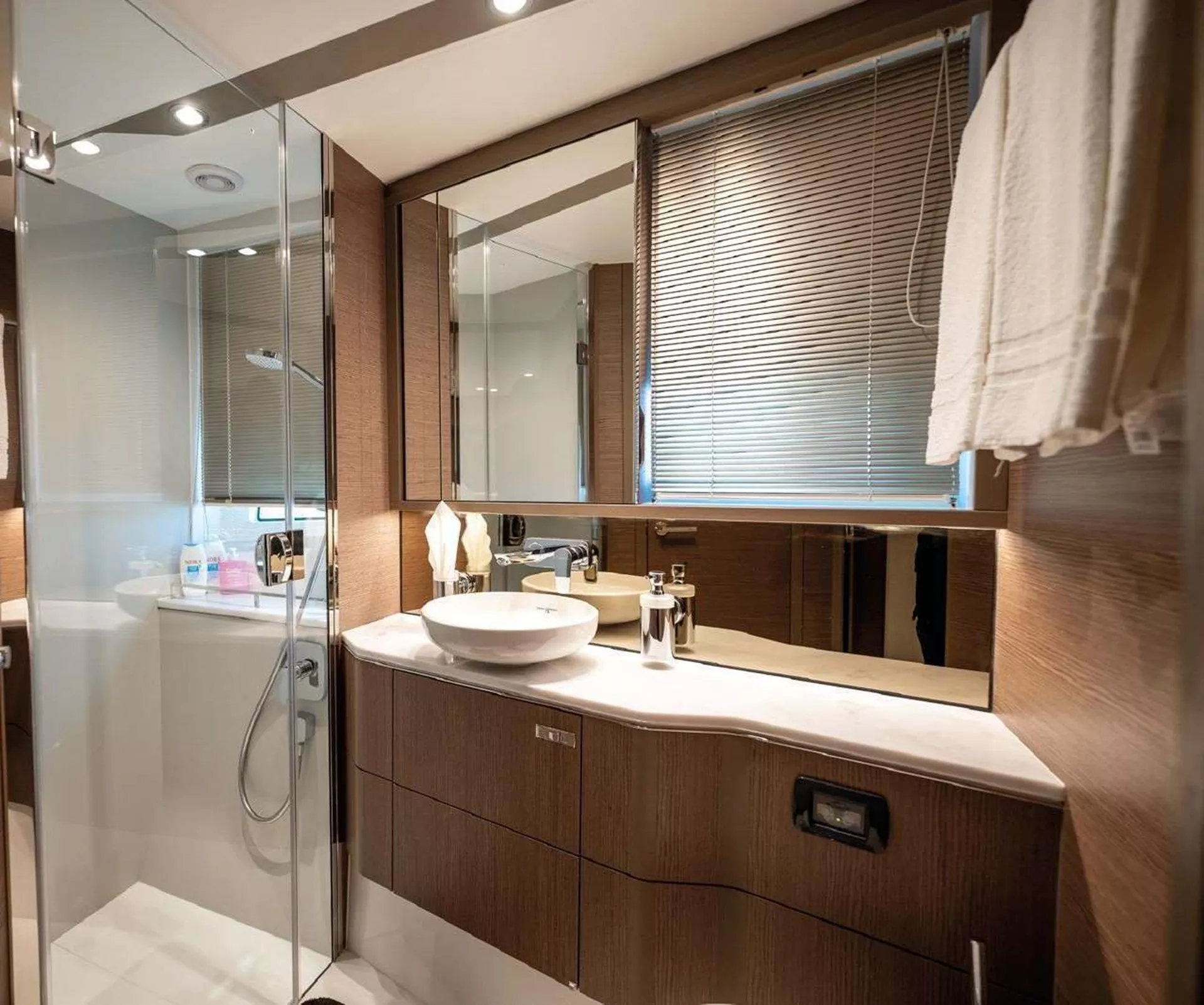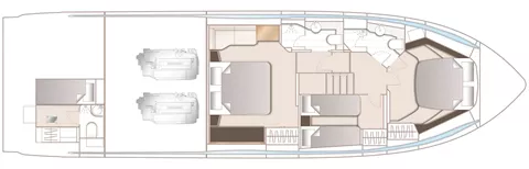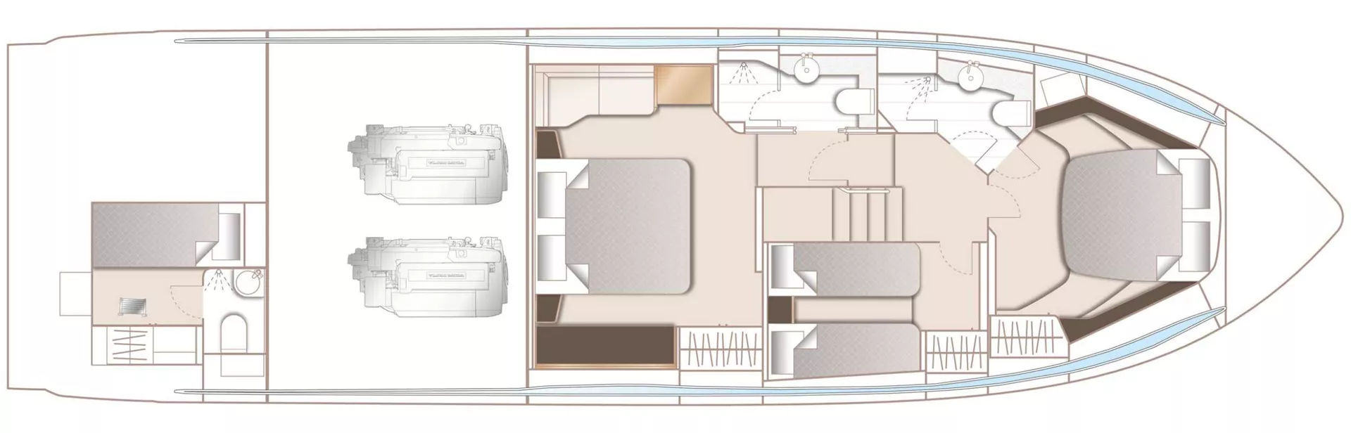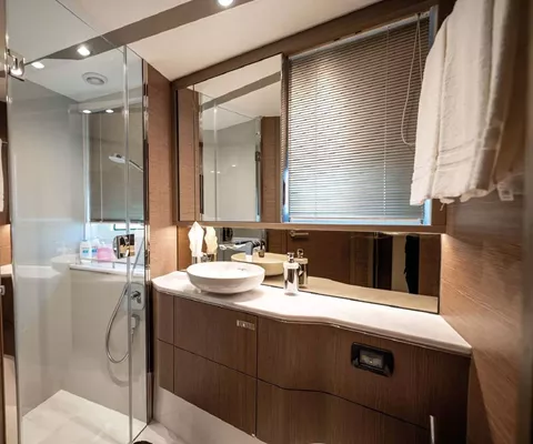 On the lower deck, six guests are comfortably accommodated across 3 cabins: an en-suite full-beam owner’s stateroom with ensuite bathroom, one Vip Cabin, one Twin cabin convertible into double.