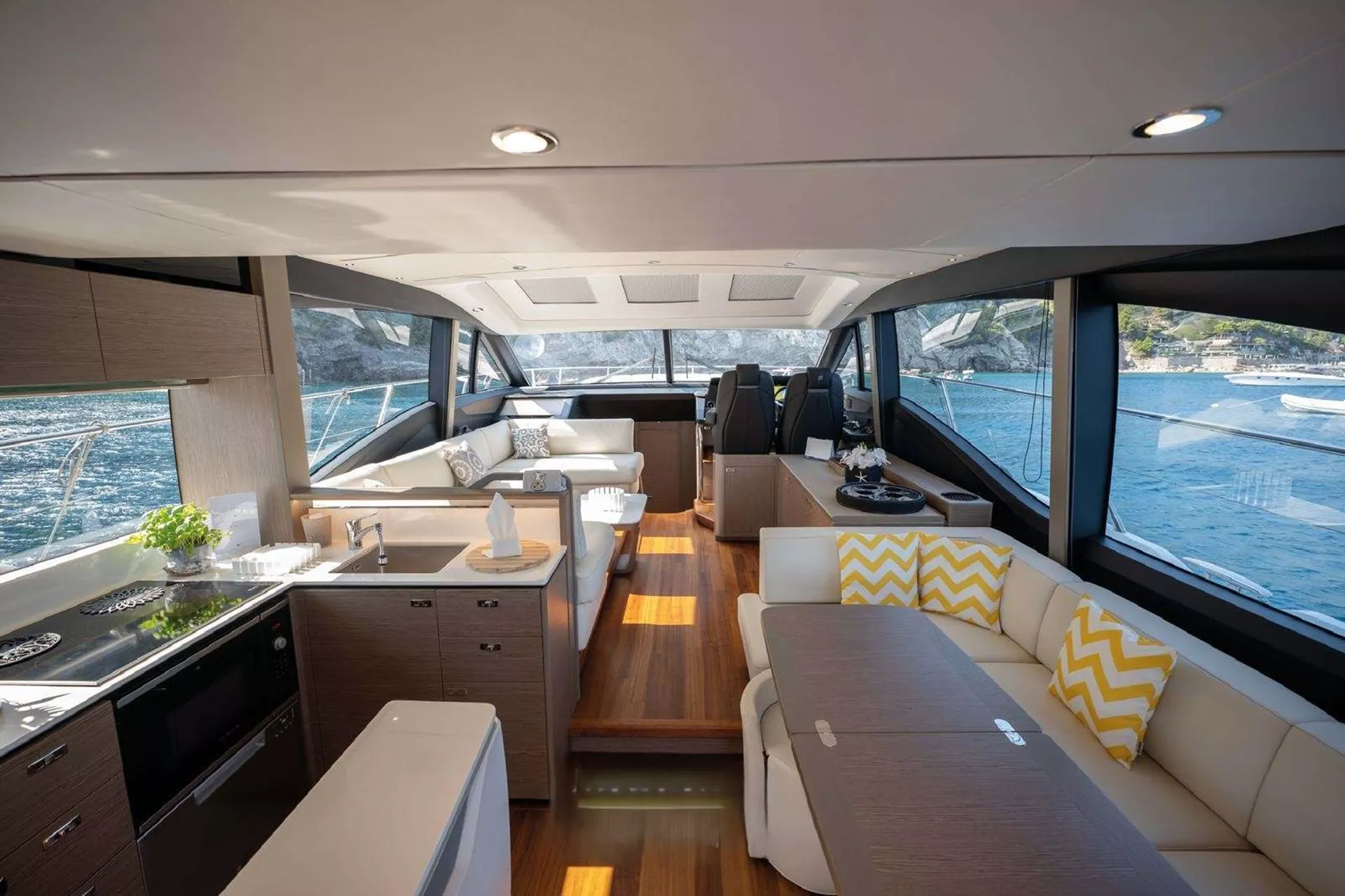 The sociable layout includes a galley aft arrangement with an open-plan dining area featuring sliding doors and a fully opening window leading out to the cockpit.