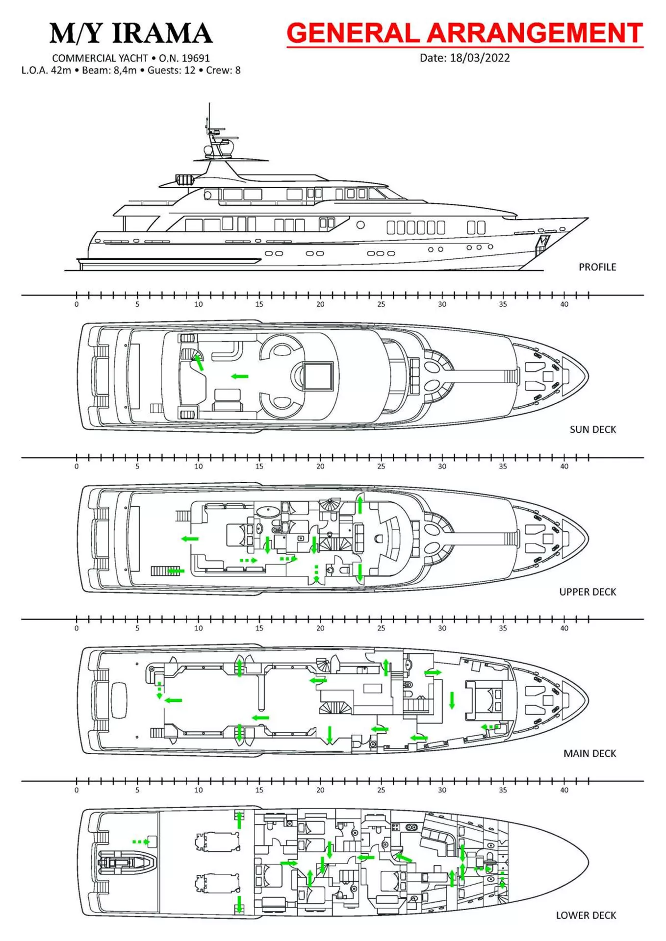 IRAMA is a 42m (137') luxury motor yacht by Concept Marine, based in the South of France and Sanremo. She accommodates up to 12 guests in 6 spacious cabins, including a full-beam Master Suite on the main deck and a VIP cabin with direct outdoor access on the upper deck, and 4 cabins located on the lower deck.