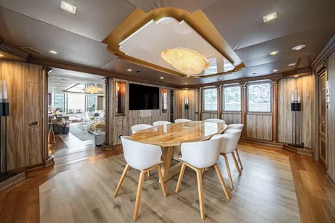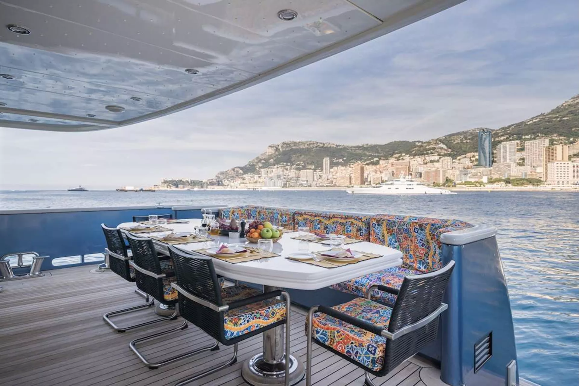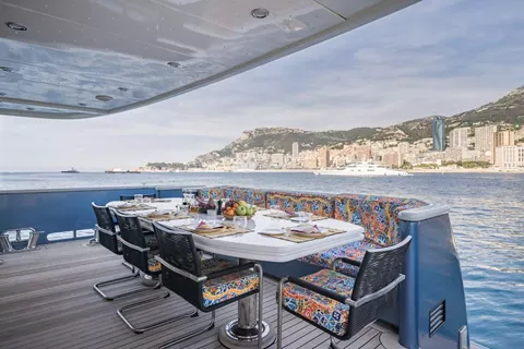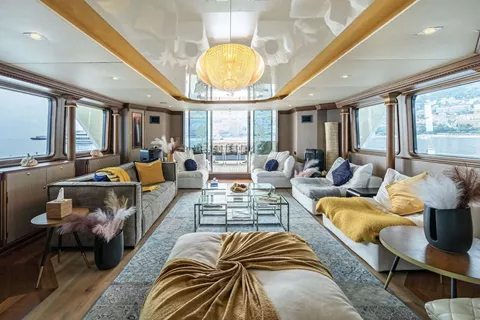 Her modern interior features a large salon, formal dining room, and office space, while outside, guests can relax on the expansive sundeck with lounge areas, a jacuzzi, and panoramic views.