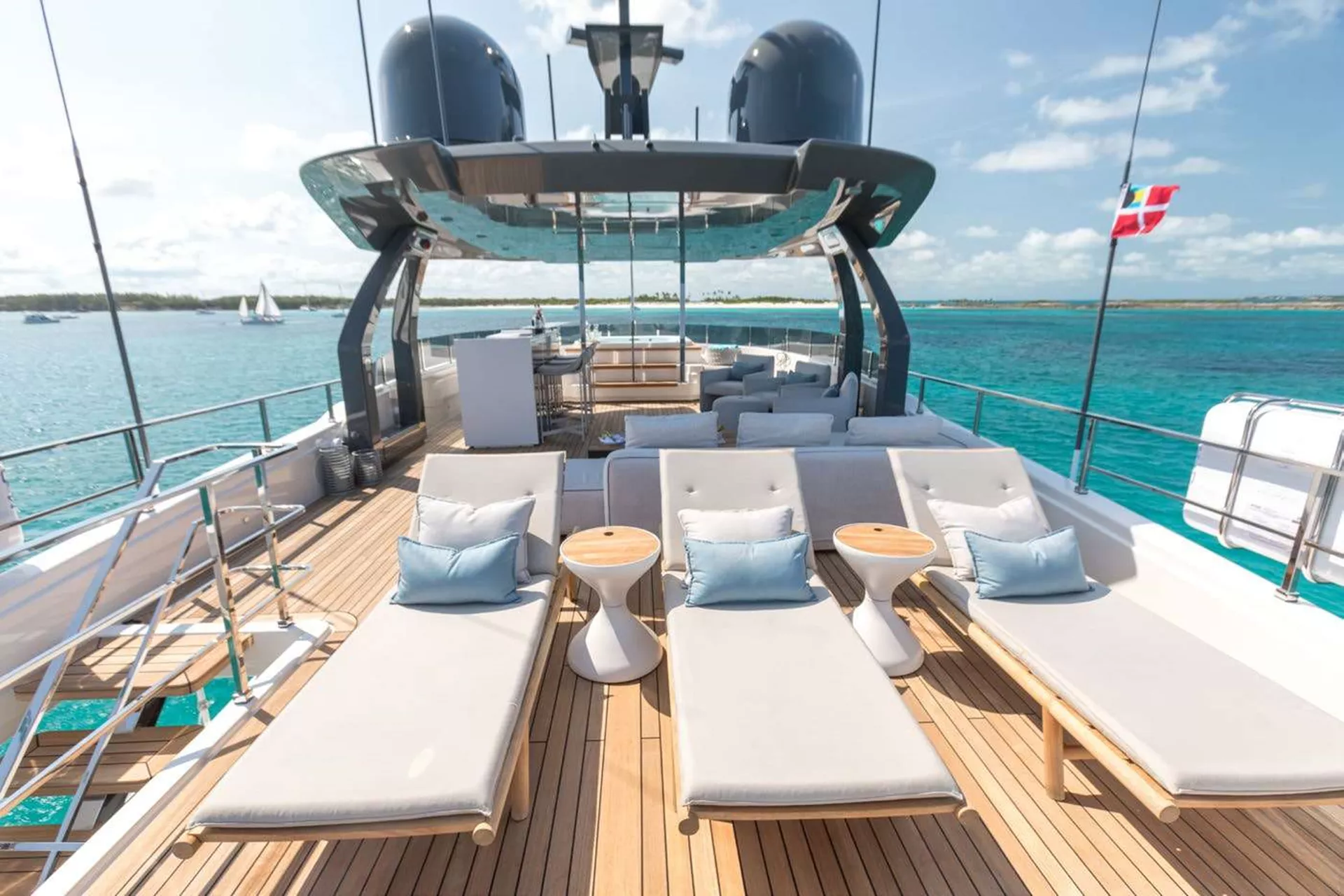 EROS features a Main Deck Master Stateroom with an ensuite, and also with a seating/ office area. Below deck you can find 4 other staterooms. Forward port stateroom is a fixed queen, and forward starboard is a fixed twin stateroom. Aft there are 2 more staterooms that are convertible from a queen into two twin beds or vice versa.