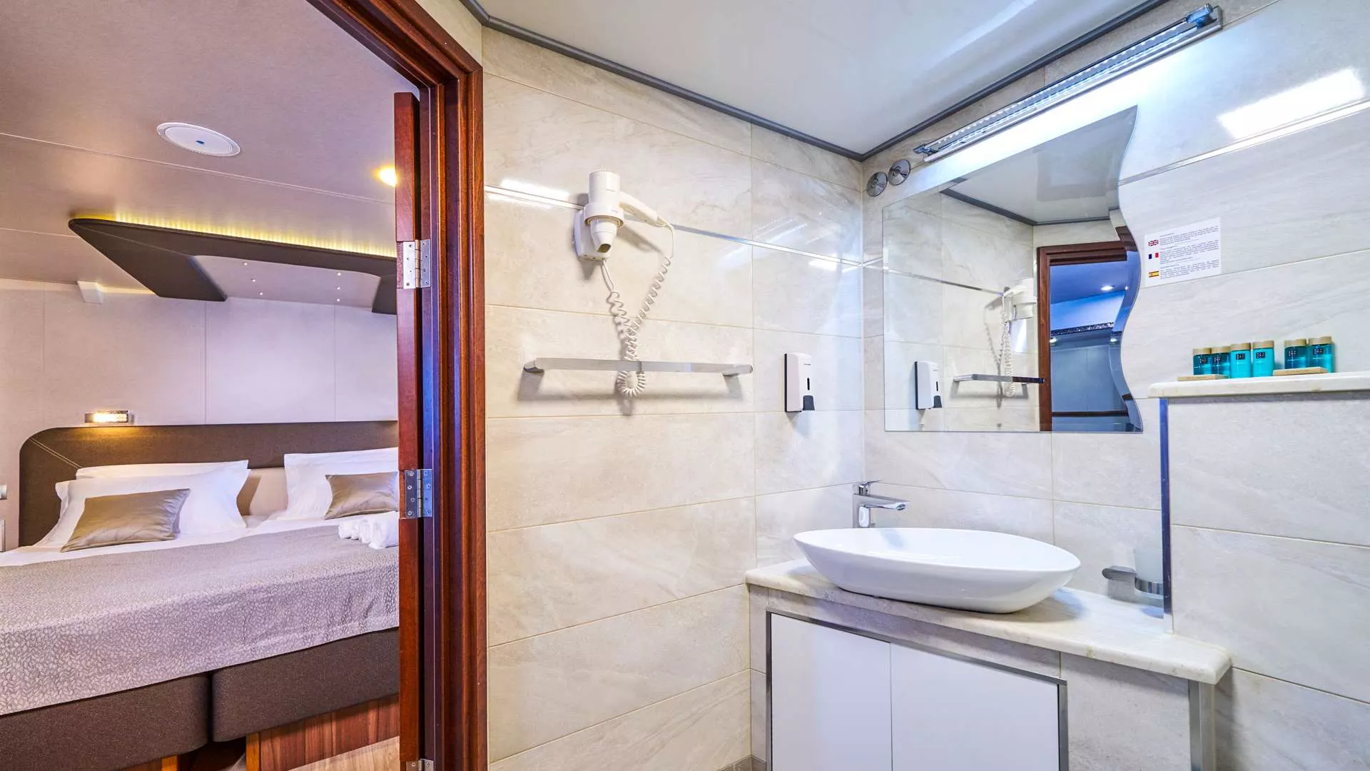 All cabins are equipped with air-conditioning, LCD TV, free WiFi, a work table, mirror, safety box, night lamps, wooden wallboards, chair, electricity supply, safety and fire alarm installations, mini bar, hairdryer and ensuite bathroom with shower cabin.