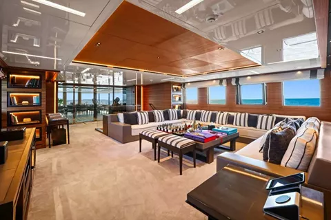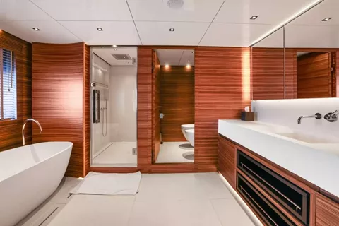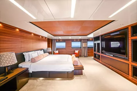 VIP Suite / Aft: Generous walk-in closet, direct deck access, plus a versatile space that can serve as a child’s playroom/office or accommodate an extra bed with an additional attached bathroom.