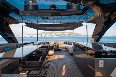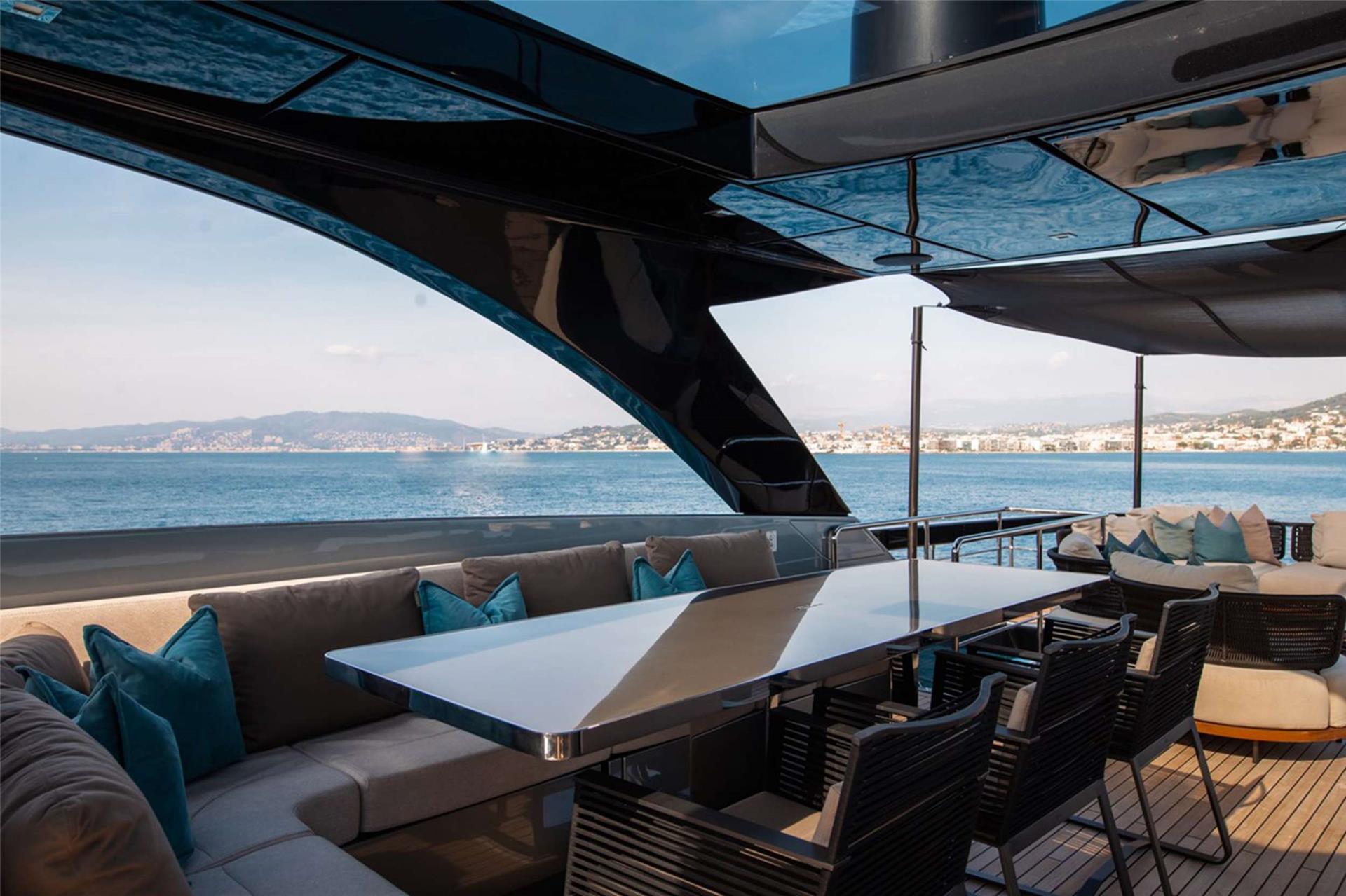 On the aft deck, a beautifully arranged dining table faces port and starboard, in true superyacht fashion — ensuring no one ever misses the view.