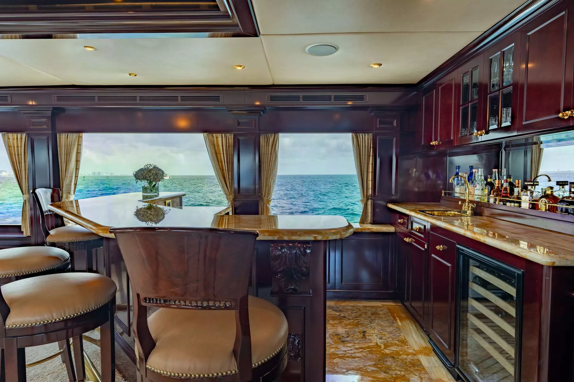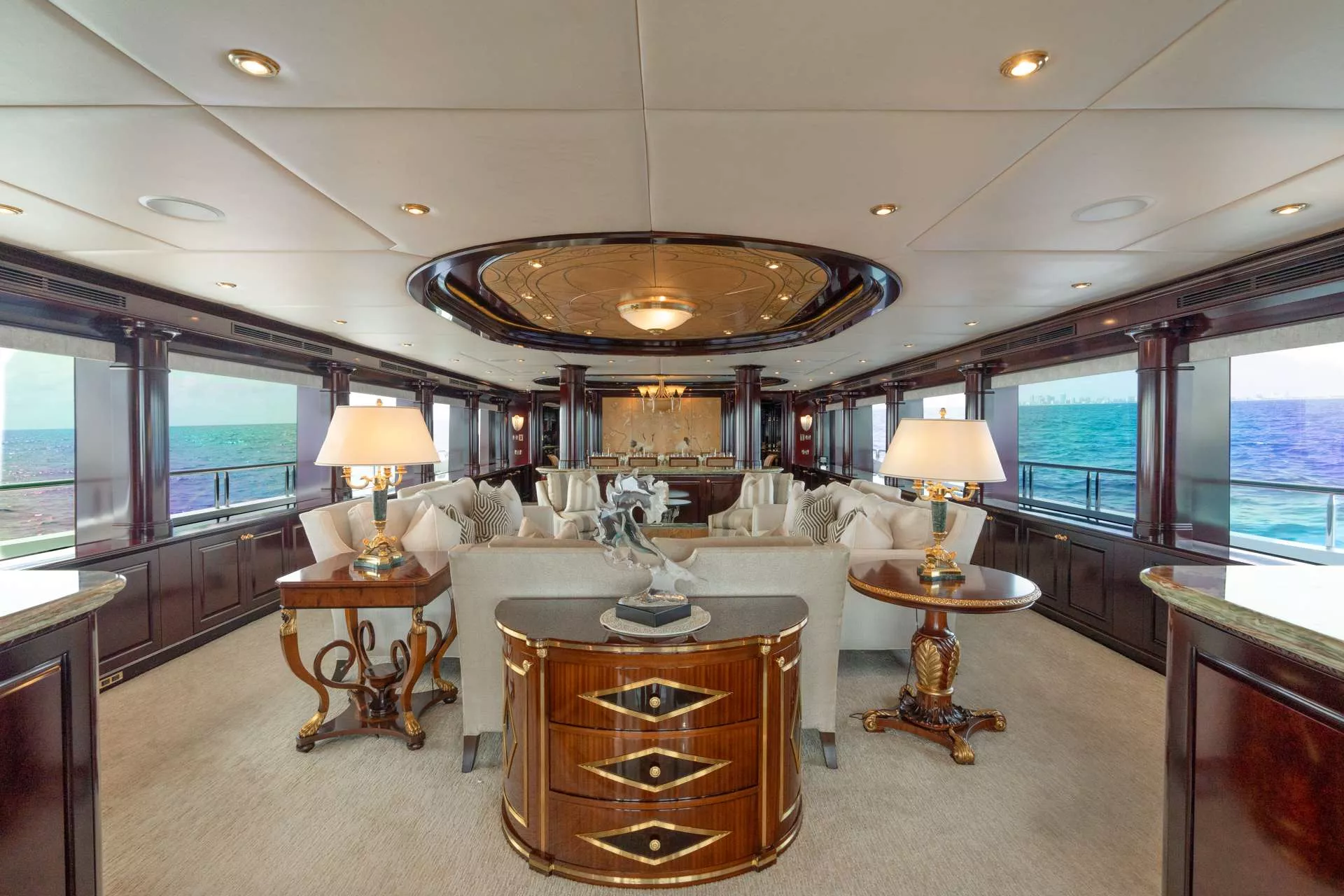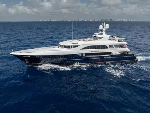 MISS CHRISTINE was christened in 2006 and built by Trinity Yachts. She has been impeccably maintained through the years and recently refit.MISS CHRISTINE features a dark cherry wood interior. Her highly customized interior features custom accents and artwork in ceiling panels of the main salon and sky lounge, a custom artwork piece in the dining salon and handpicked inlaid marble throughout her interior and master bathrooms. At 157’ long and 28’ wide, her interior and exterior offer guests abundant space along with luxurious surroundings. The shallow draft of 7’ makes her a top pick for cruising in the Bahamas. MISS CHRISTINE is equipped with an ultra-modern stabilization system which reduces the roll motion while underway and at anchor. This ensures guests are comfortable at all times on board. The main salon offers a lounging area with entertainment system as well as formal dining forward. The sky lounge layout includes a full sit down bar, game table and comfortable living room area. The aft deck on the main salon level has a beautiful wood table for dining and access to the swim platform and all of the water toys. On the sky lounge many fun themed dinner parties happen at the enormous round table for 12 and there are also aft lounging areas and stairs to the sun deck. The Jacuzzi on the sun deck is a popular guest area and there are sun beds surrounding, a dining option, gym equipment, an assortment of water toys. MISS CHRISTINE operates with a crew of 9 who have many years of charter experience and several charter groups that have returned for multiple charters.