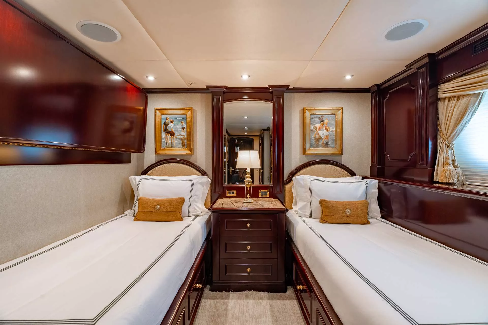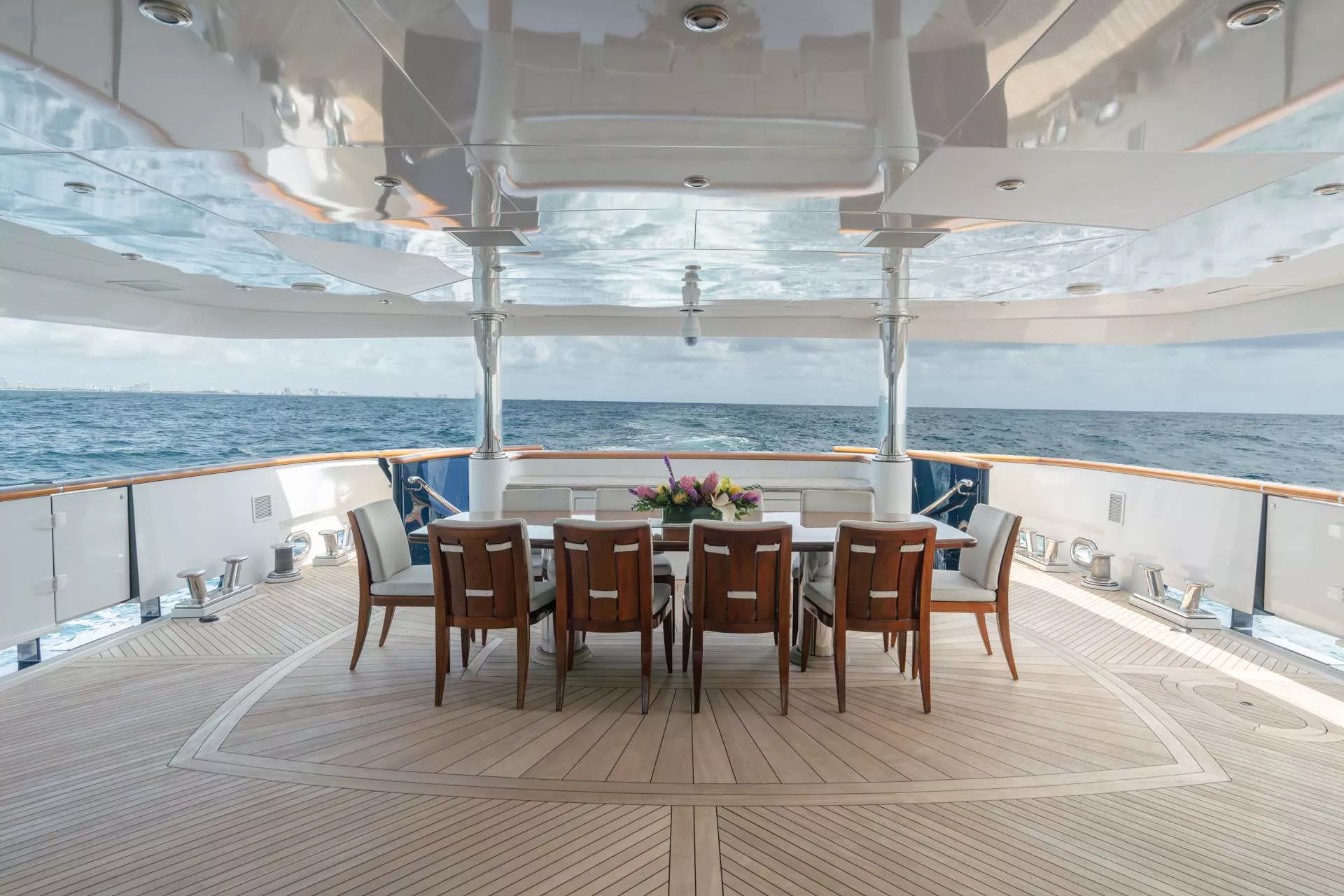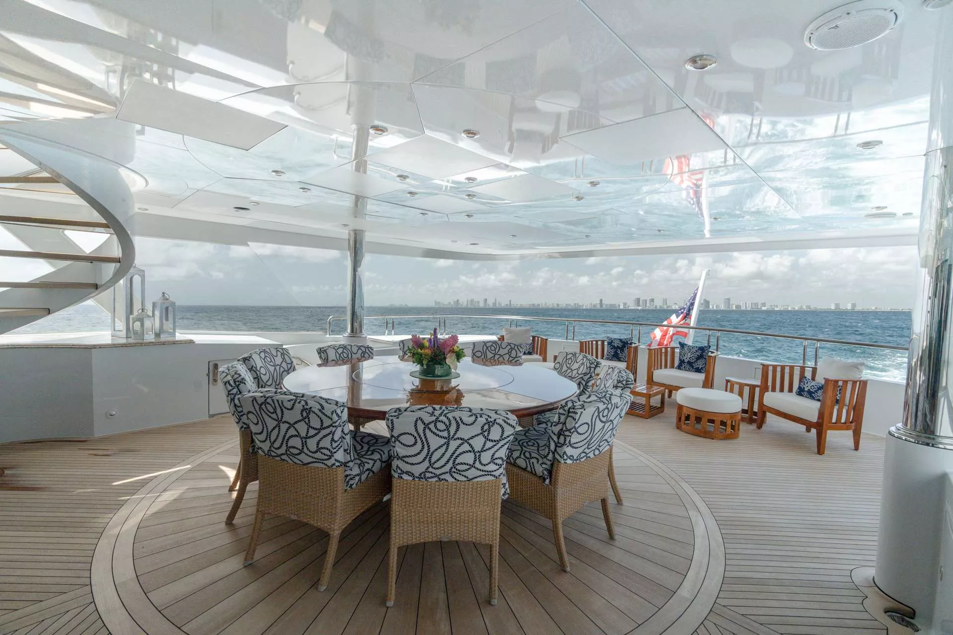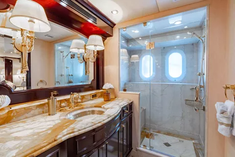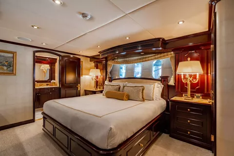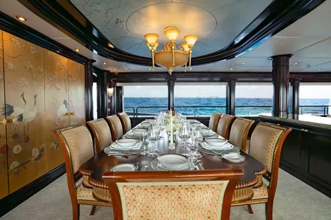 Accommodations are suited for up to 11 guests in 5 staterooms; including a master suite, 3 king guest cabins and 1 cabin with 2 twin size beds and a pullman bed. Her master stateroom is on the main deck with large windows for natural light, a private office area, full wine storage, mini bar, a king size bed and his-and-hers lavish master bathrooms. MISS CHRISTINE’s guest cabins all have full entertainment systems, large closets and spacious bathrooms that are of the same quality and finish of the master.