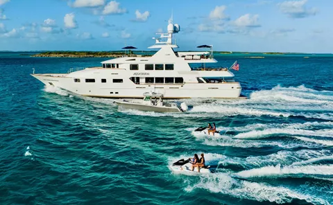 Aquasition, a 142’ Trinity yacht whose spectacular interior features cherry wood joinery with