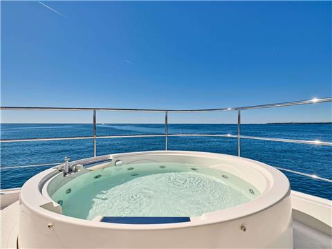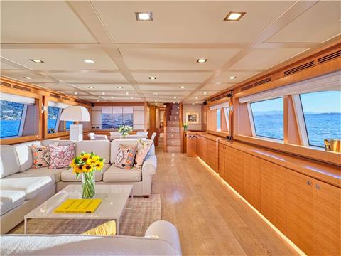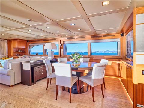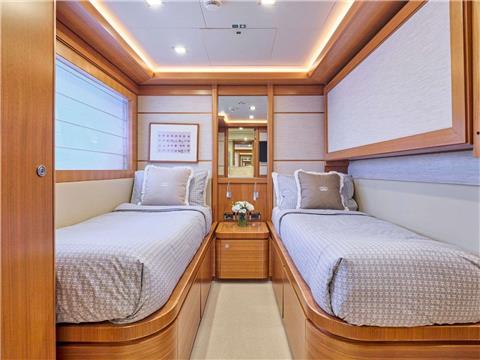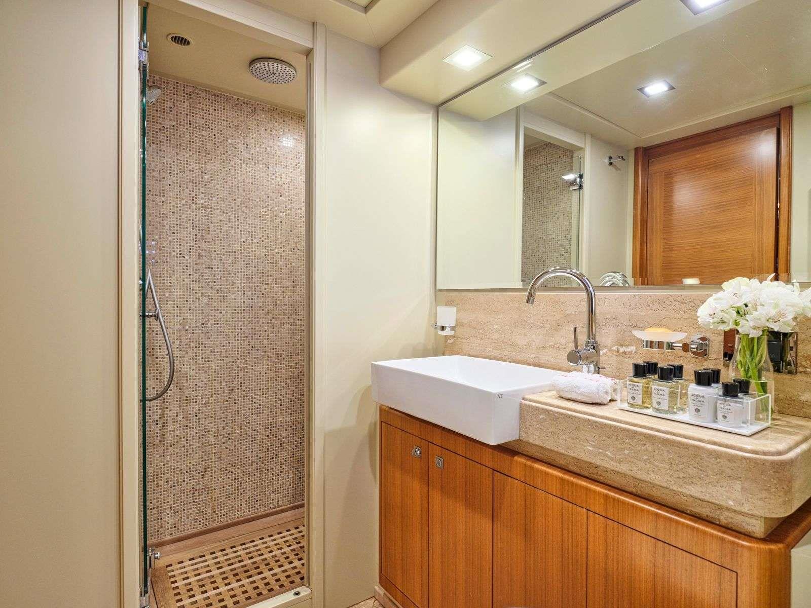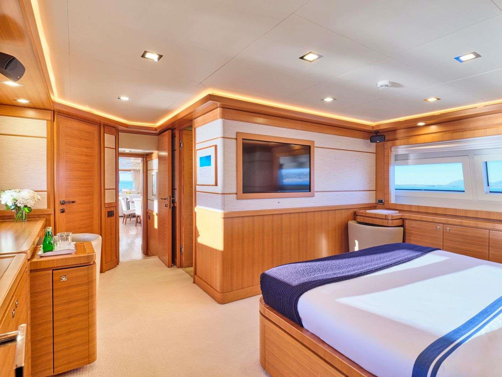 A Master cabin with King Size Bed (2.00cm x 1.80cm) on the Main Deck with 2 Walk-in closets, Safe and en-suite facilities: Double Shower and Wash Basins, WC and Bidet. Total Cabin Size: 22 sq. m