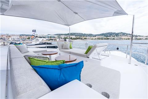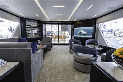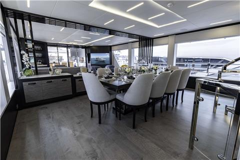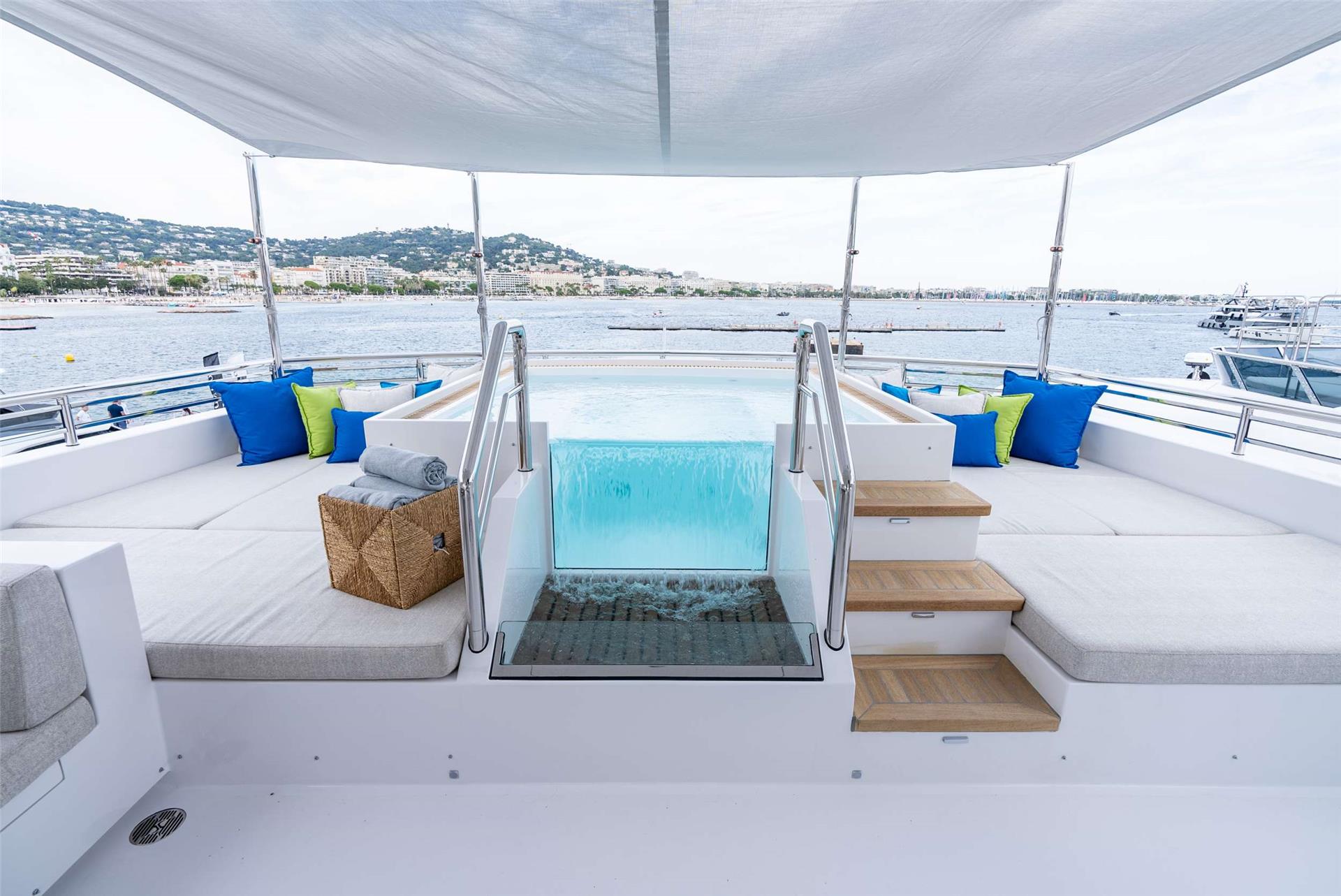 Elevate to the sundeck and immerse yourself in the waterfall infinity-style Jacuzzi and have lunch in the roomy dining area. An additional bar and day head are located on this level for accessibility and convenience. Roam around to the oversized sunbed on the bow and soak up some sun rays, all while getting lost in your favorite book…or the view! Moving down to the special feature in the beach club, there is a hydraulic swim platform that can open at anchor for sunbathing and spectating. Also at the beach club, take a turn in the steam room.