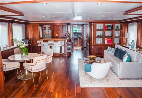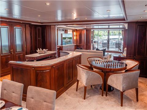 She offers guest accommodation for up to 10 guests with a layout comprising a master suite located on the main deck, two VIP cabins, one double cabin and one twin cabin. There are 8 beds in total, including 1 king, 3 queen, 2 singles and 2 pullmans. She is also capable of carrying up to 7 crew onboard to ensure a relaxed luxury yacht charter experience.