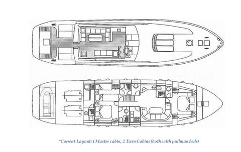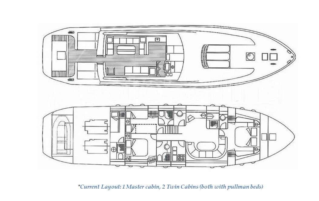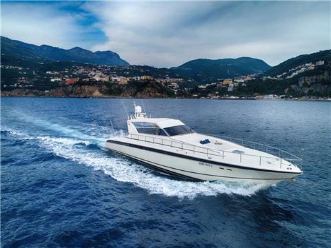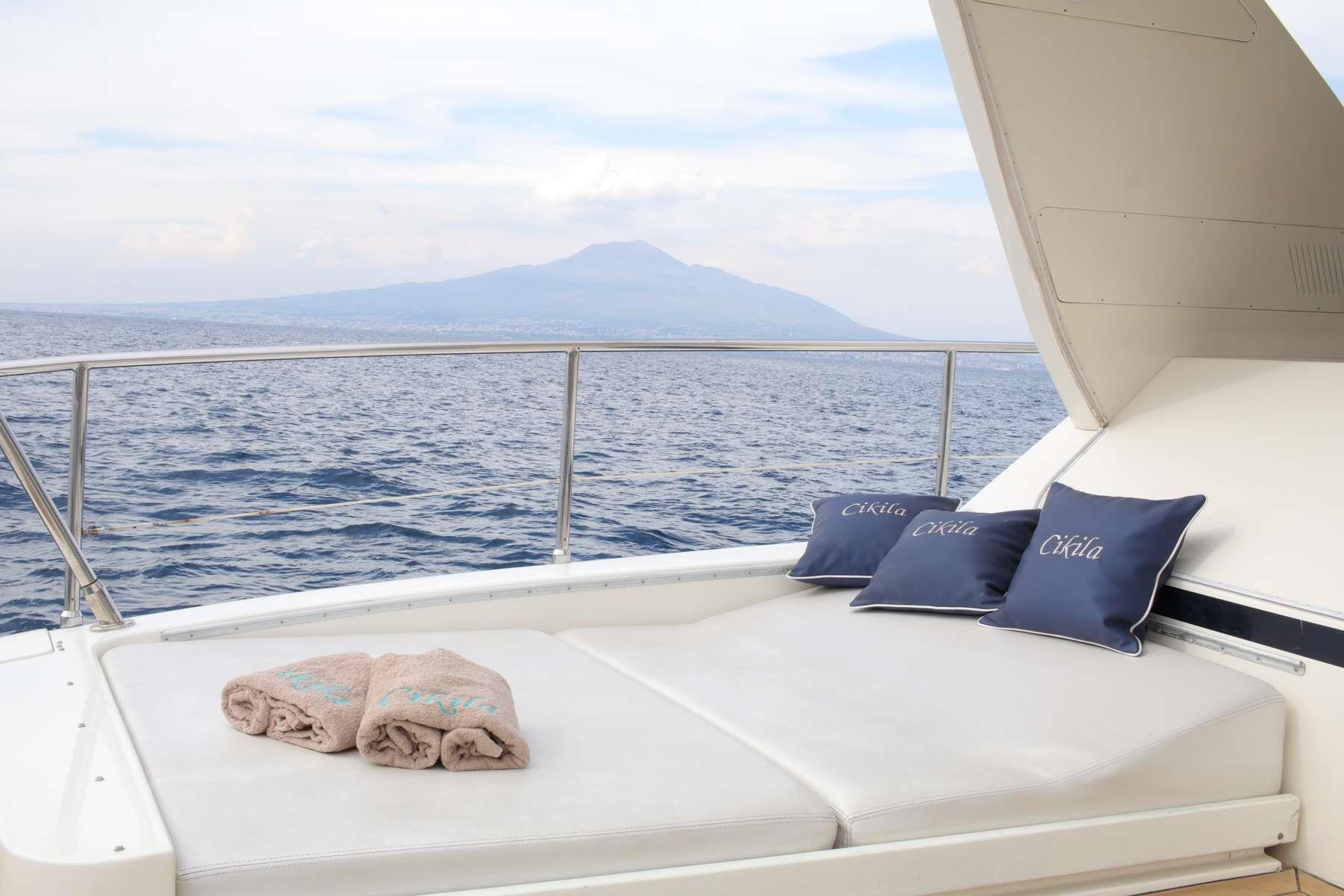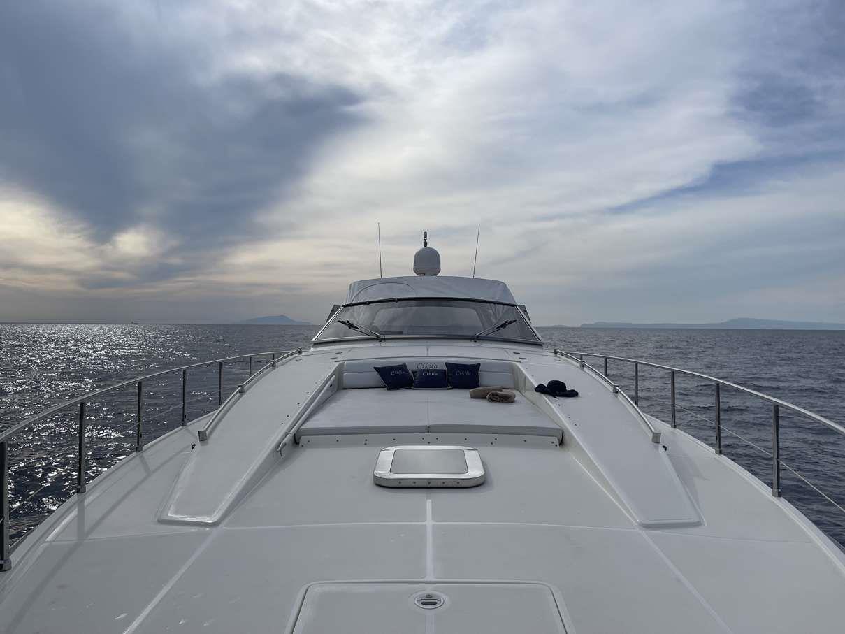 Cikila is a Leopard 23 Open Yacht, built in 2000 and fully refitted in 2022. She accomodates up t 8 guests in 3 comfortable cabins: a cosy full beam master cabin and two twins with an additional pullman bed. The beautiful main salon is classically decorated and features plenty of glossy wood finishes and soft cream leather upholstery. The dining area includes an innovative descending table, allowing the space to be transformed into a lounge area where guests can watch TV or simply relax while sipping a cool cocktail. The sun deck is equipped with a TV screen, a dining area with a drop-down table and a large sofa where you can relax with a drink. Guests will also find two comfortable sundecks, one at the bow and one at the stern, both equipped with cushions.