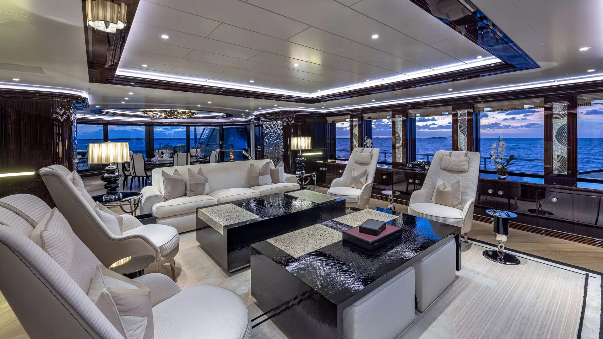 Dining area for 12 guests with fully retractable circular doors, extending the entertaining area to the exterior aft deck.