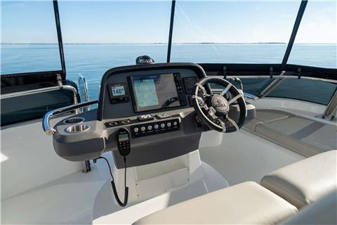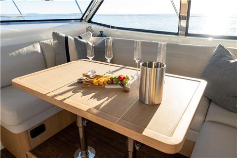 To complete the sleeping area, we have a fourth cabin on the property with a big bathroom and shower box. The inside layout is completed by a huge and deluxe dinette, a kitchen located just in front of the cockpit, and a wet bar that looks out on the cockpit. This modern kitchen position will allow you to either fully enjoy the cockpit or prepare amazing dishes to have with your family and friends. The yacht also has a generator, air conditioning, and a hydraulic crane that will allow you to haul and launch a big tender or a jet ski.