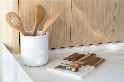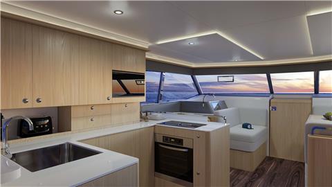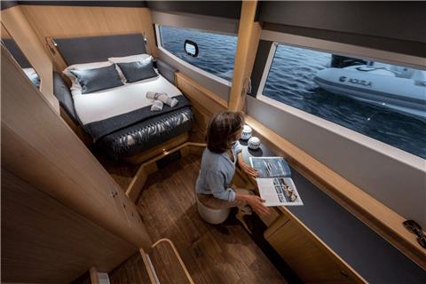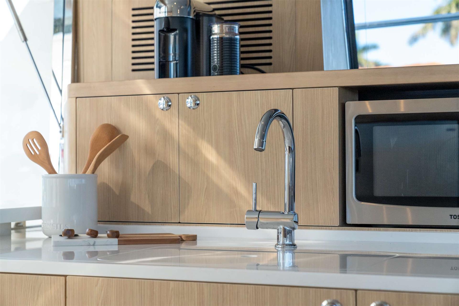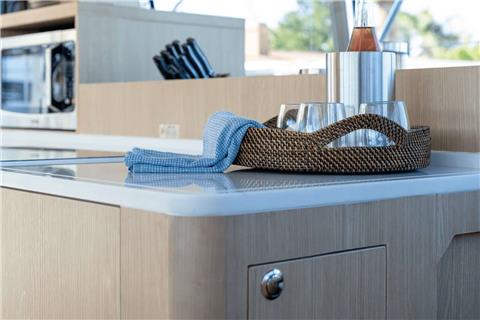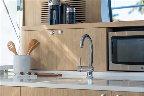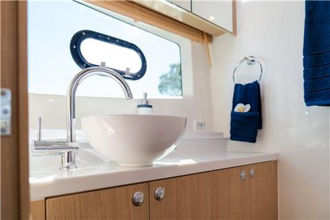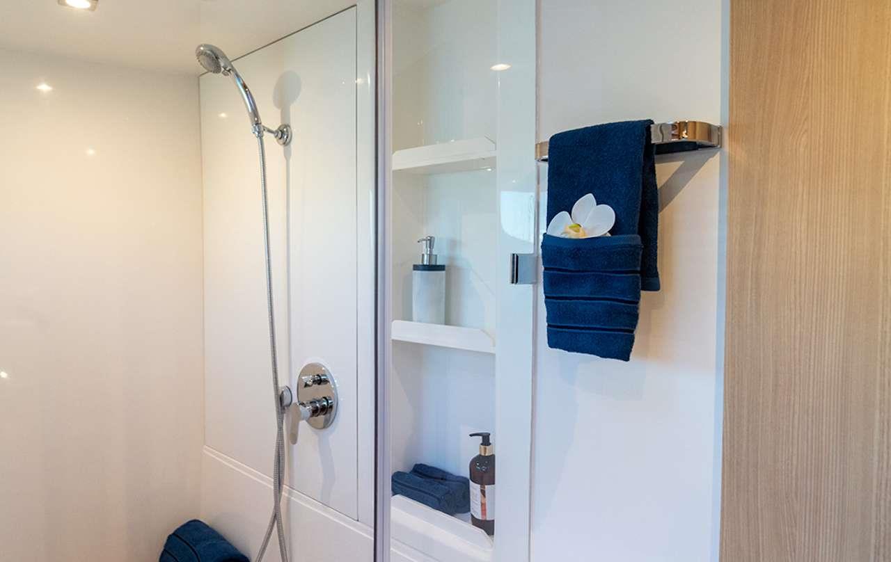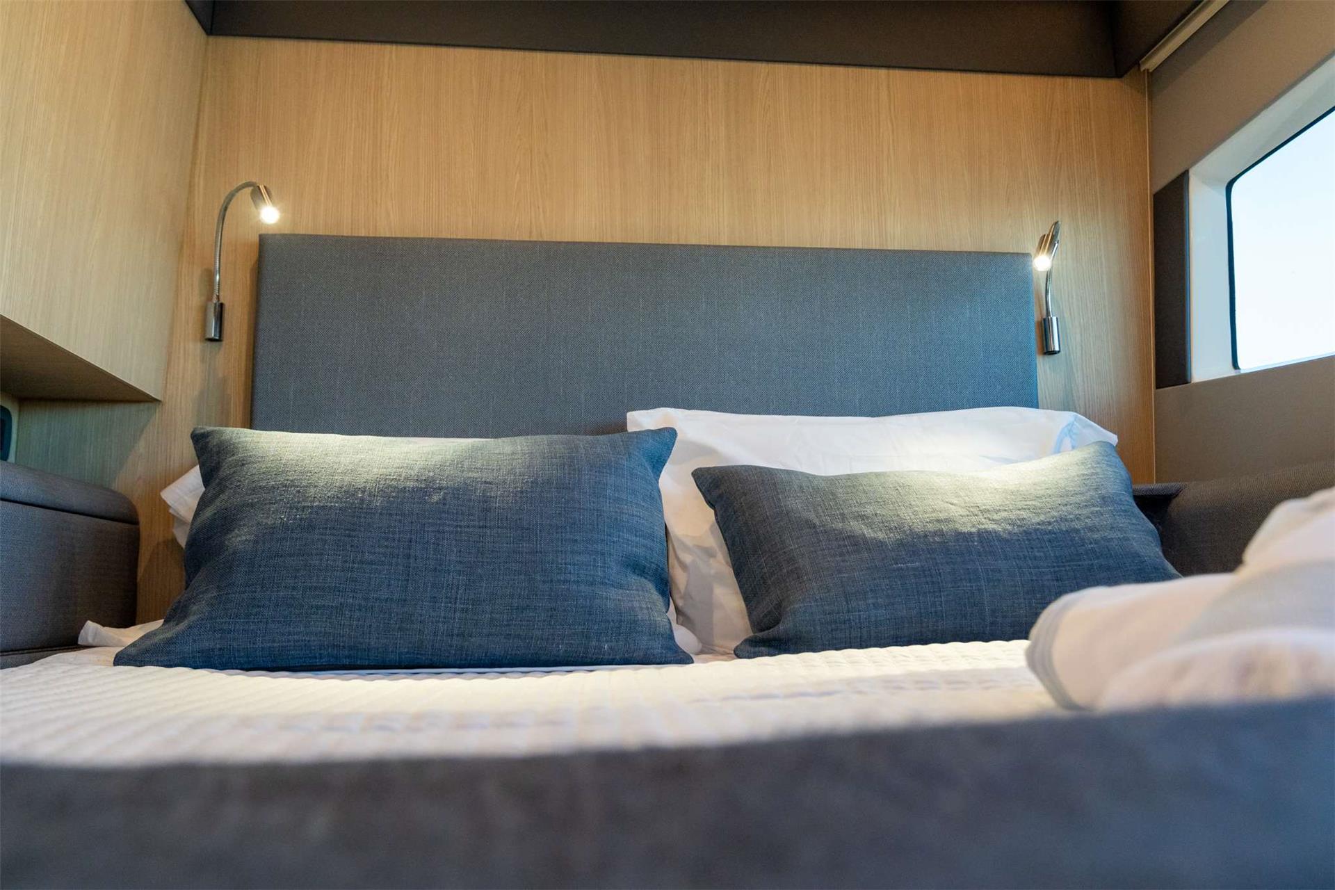 A large soft pillow on the huge prow will take care of you under the sun. Inside, we found a spectacular owner’s cabin, located in the right hull, with a king-size bed and a private, spacious bathroom with shower. Also, there are two more cabins with double beds and one bathroom with a shower where additional guests can enjoy luxurious living comforts.