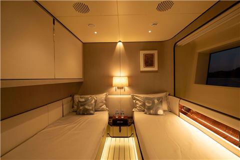 A full width owner's cabin with private balcony, 2 VIP cabins and 2 twin guests cabins converting to double bed with additional pullman bunk.