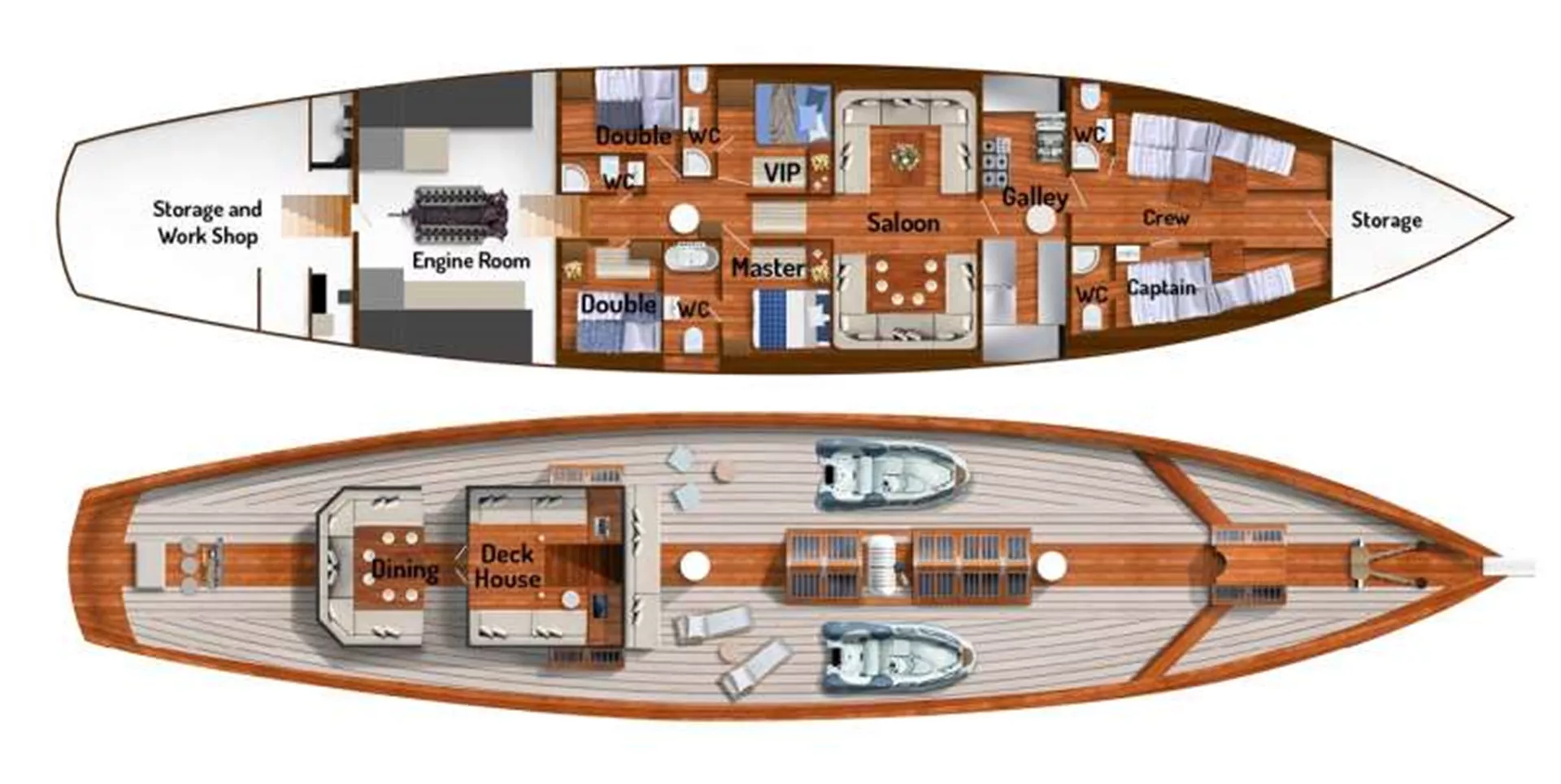 The crew quarters are separate, forward of the galley, and have six bunks and two more heads and showers.