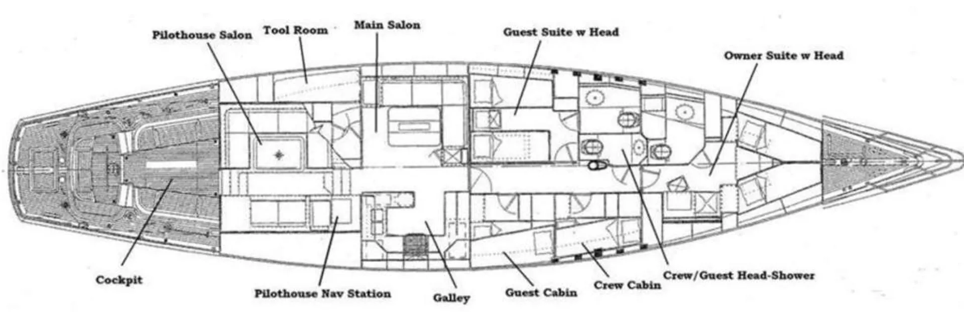 Also aft of the master on the port side is a common head with shower (shared by crew). On the starboard side are two well-appointed guest cabins (one of which are used by the crew), each with over and under single berths, a bureau and hanging locker. These two cabins share the common head and hand-shower.