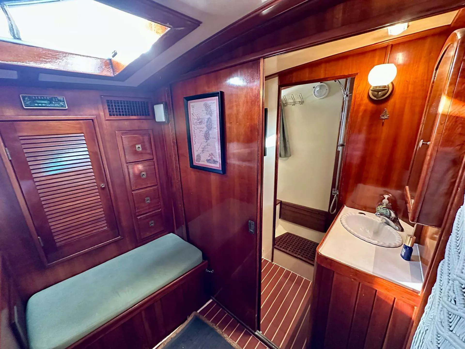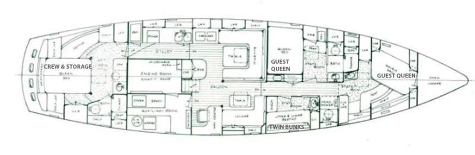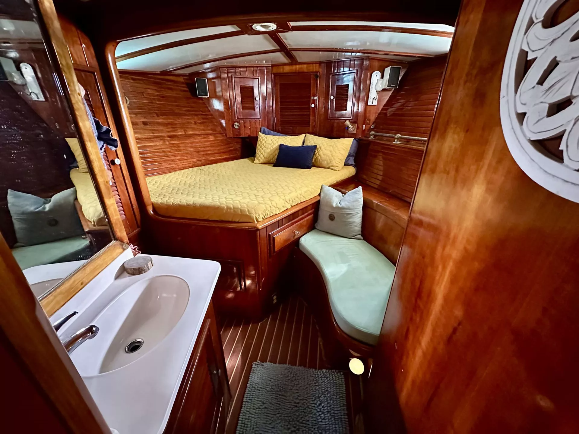 (1) Twin cabin with upper lower berths. This cabin also has an ensuite vanity and shares head with Queen V-berth cabin above however it does have it's own vanity and sink in the cabin.
