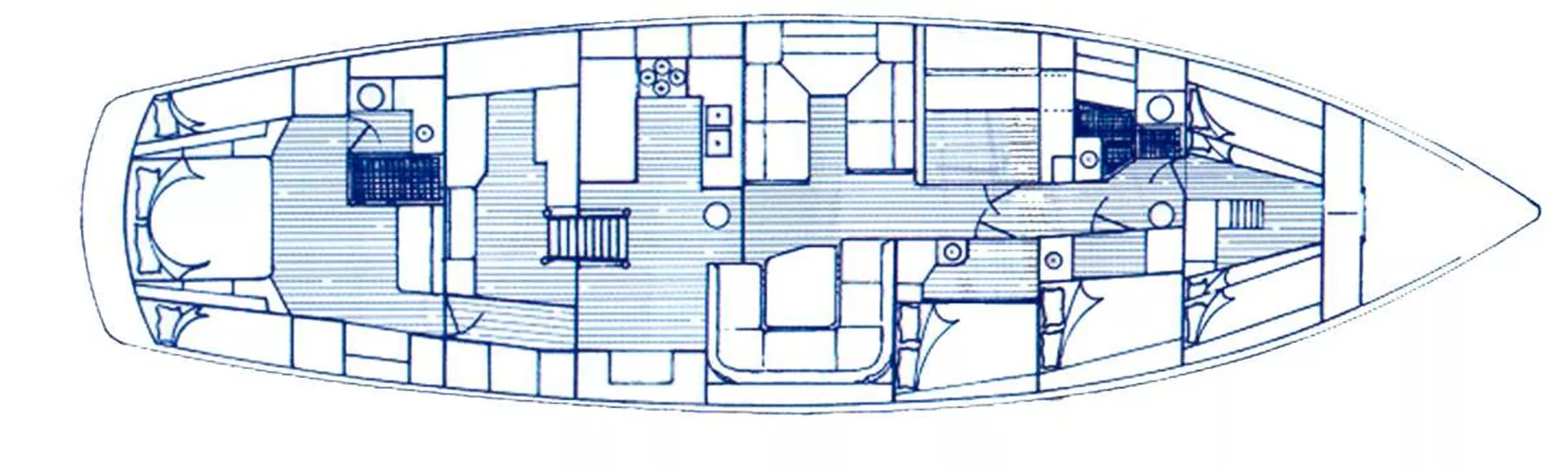 The two forward staterooms have double beds with vanities, hot and cold water sinks, and a vanity mirror. Both staterooms have closets and chests of drawers for clothing storage. The forward stateroom has a fold down writing desk. Each room has its own deck hatch and multiple opening porthole openings for fresh air. Both staterooms have their very own private head and shower.