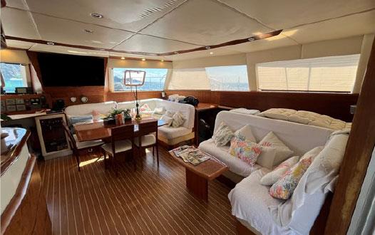 Outdoors, enjoy multiple spaces for relaxation: a sheltered cockpit, forward trampolines, a sunbathing area, and a spacious flybridge perfect for entertaining.Powered by twin Yanmar diesel engines (110 HP each), she cruises comfortably at around 8–9 knots, reaching up to 12 knots under power.