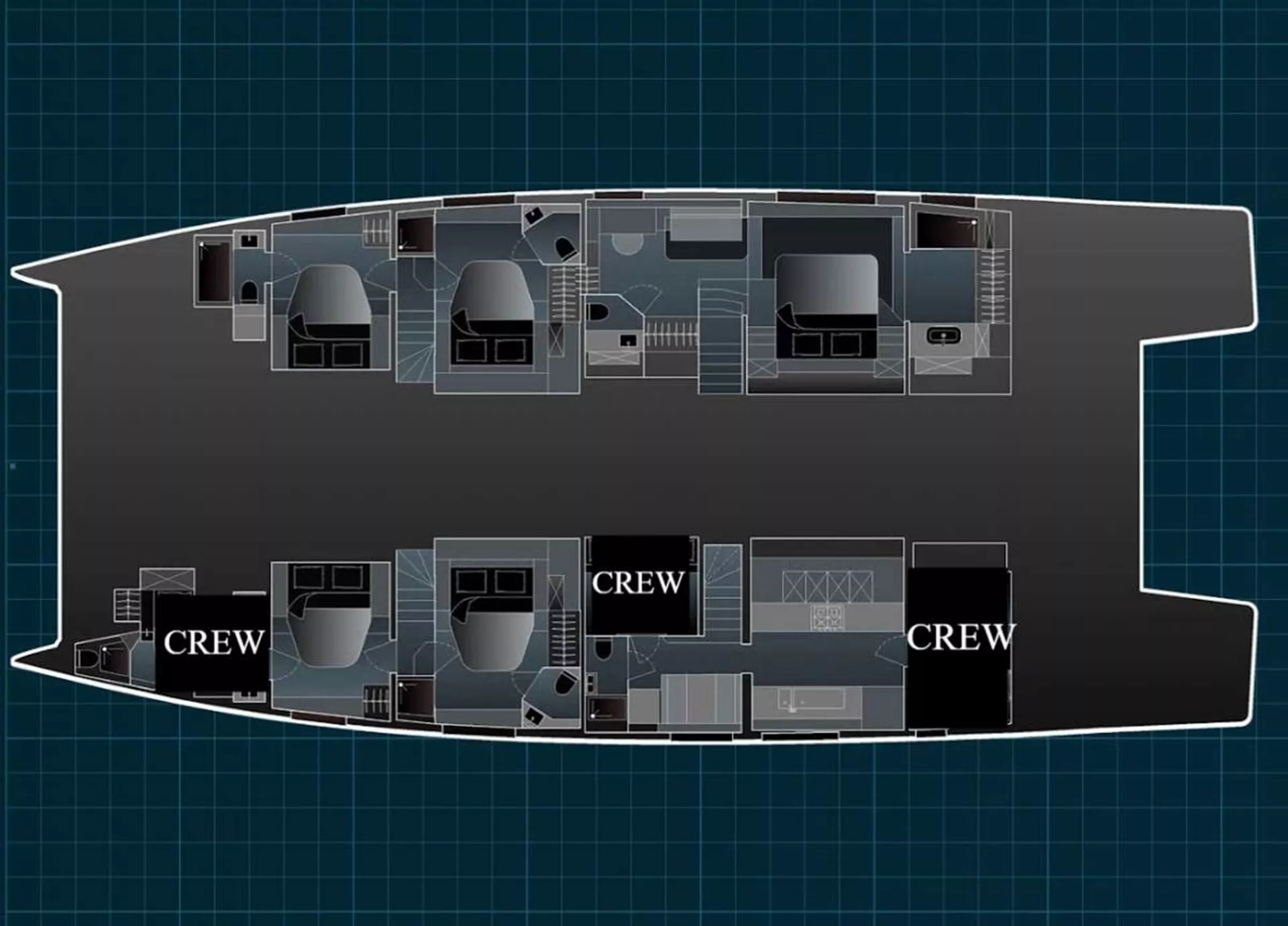 1 Owner's Cabin and 4 guests cabins, all with their private bathrooms. Galley down.