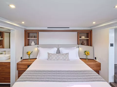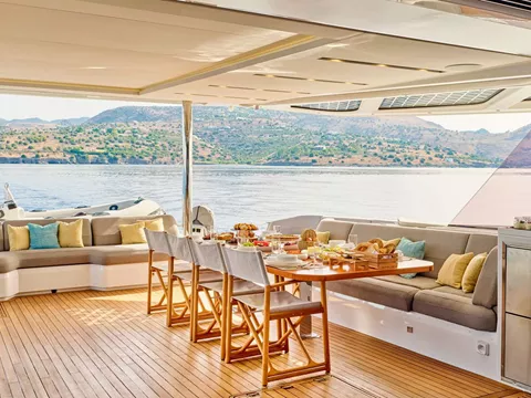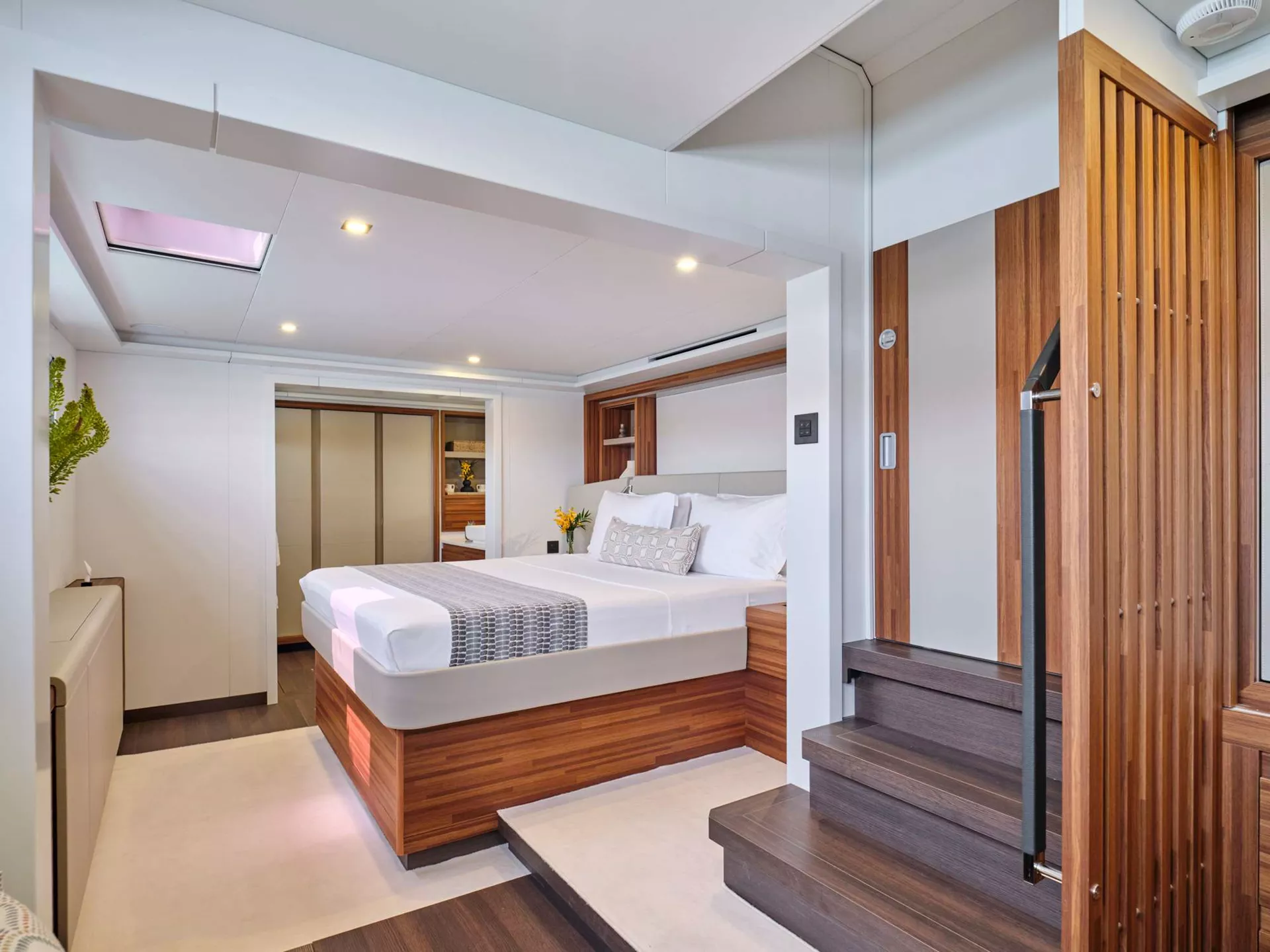Inside, the beautifully appointed main saloon welcomes guests with refined décor, an indoor dining area, and a galley-down layout designed for both comfort and functionality. Every detail reflects superior craftsmanship, cutting-edge technology, and the finest materials.