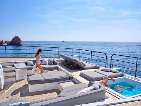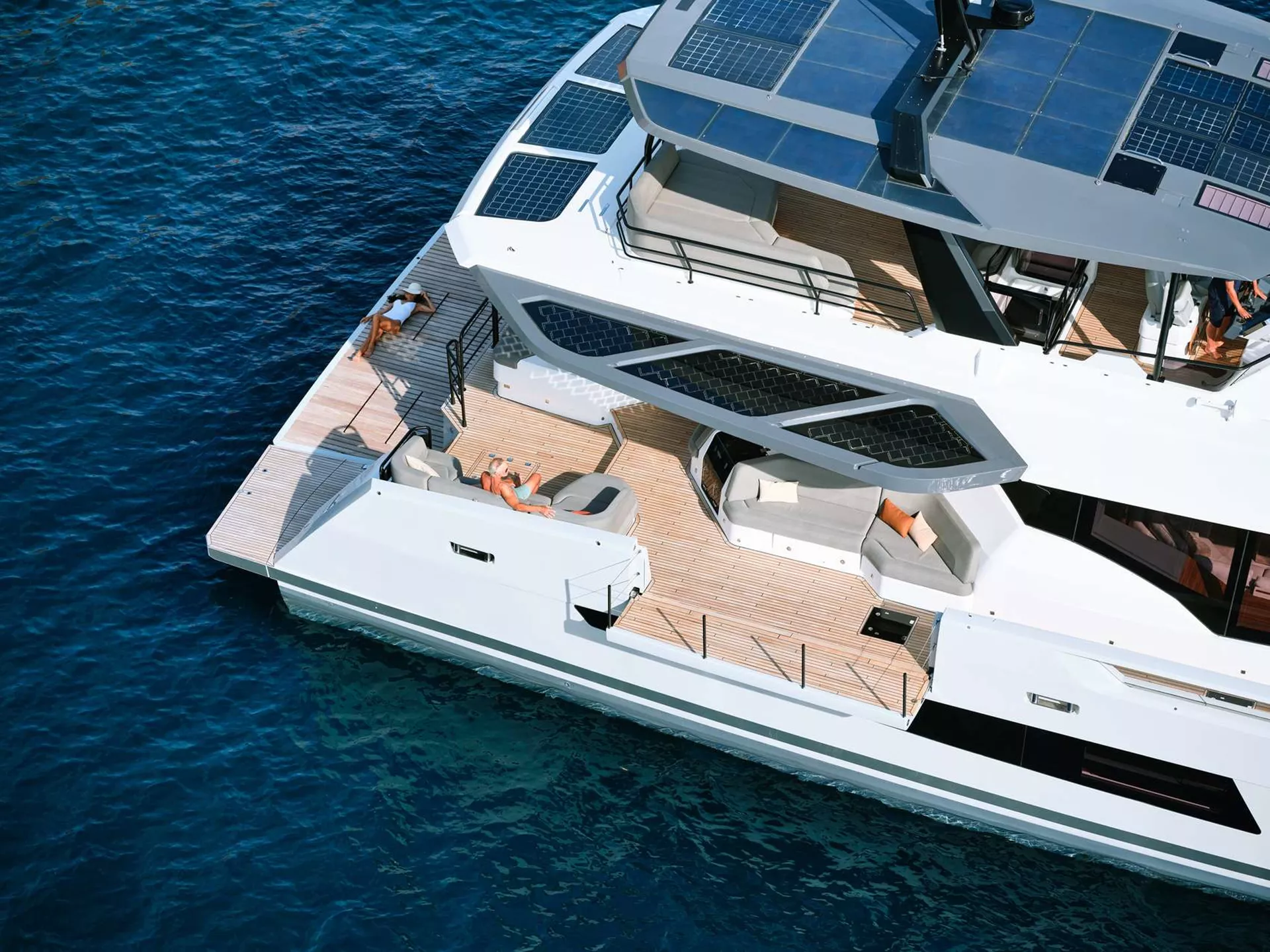 As the flagship of Fountaine Pajot’s prestigious motor yacht lineup, Alina has been crafted for extended cruising, offering expansive living areas and vast outdoor spaces that invite exploration and relaxation. Her striking aft cockpit impresses with multiple seating arrangements and foldable balconies on each side, seamlessly connecting guests to the sea. At the bow, a luxurious foredeck awaits, complete with a jacuzzi, plush sunbeds, and a convenient wet bar for refreshing moments under the sun. The large flybridge provides yet another breathtaking retreat, featuring a generous dining table ideal for unforgettable alfresco meals overlooking panoramic ocean vistas.