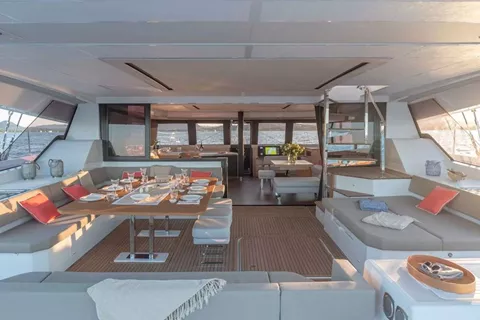 The Fountaine Pajot 67’ features generous private spaces and expansive social areas for couples, families, and friends to relax and indulge. Our spacious flybridge offers sun loungers, expansive seating and a full bar to enjoy 360 degree views of the Caribbean Islands we call home. The bow is our favorite spot to enjoy a sailing adventure, soak in the sun, relax in the jacuzzi and stargaze. Our salon offers comfortable seating options for dining, games and entertainment, a full bar, television, and Jura expresso machine. In the cockpit, Chef Belinda is sure to delight you with her award-winning culinary creations and Captain Rob’s tales of adventure are the perfect complement to our amazing sundowner cocktails.