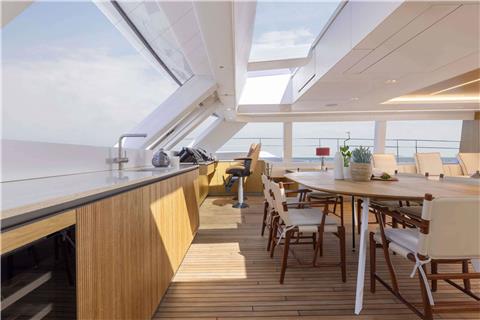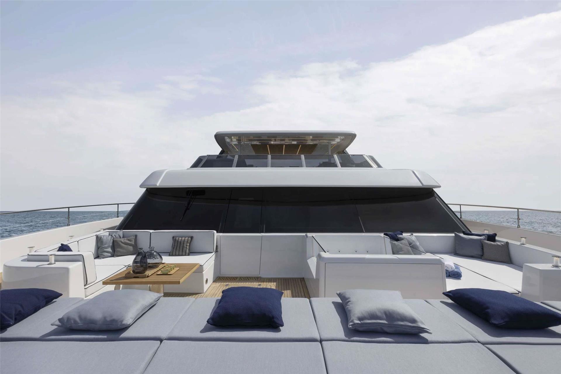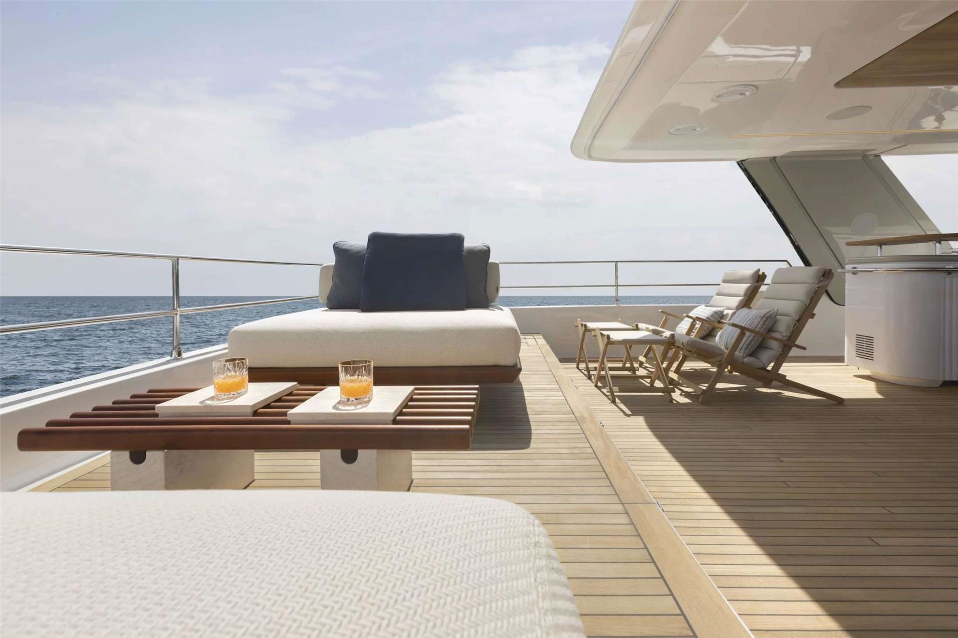 On deck, PRONTO delivers exceptional spaces for relaxation and socializing. The full-beam foredeck features a jacuzzi, while the impressive flybridge hosts a round Italian dining table with spectacular 360-degree views. Aft, guests can enjoy alfresco dining or unwind on the large swim platform, which offers effortless access to the sea.