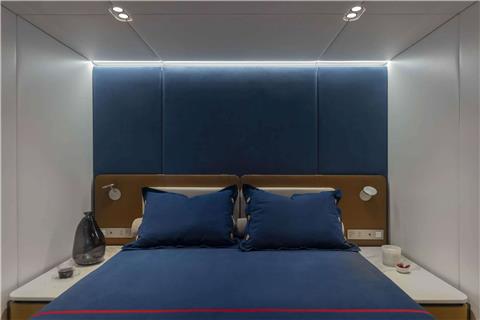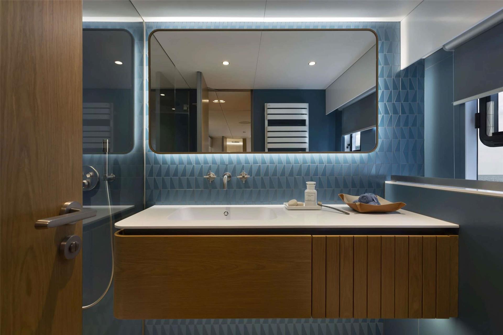 The four guest cabins are thoughtfully arranged, with a spacious master suite with king berth in the port hull, a double midships cabin, a twin forward cabin, and an aft cabin featuring a double bed plus a Pullman in the starboard hull. Each cabin offers the comfort and privacy of ensuite facilities, with the master distinguished by striking azure blue tiling and an expansive shower cubicle. The remaining suites continue the theme, accented with touches of azure blue and clean, contemporary lines.