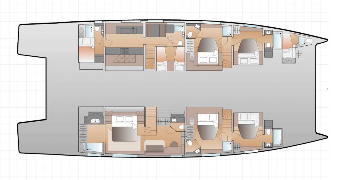 One master cabin (Bed size 1,80 x 2,00 m) and four queen bed guest cabins (bed sizes 1,60 m x 2,00 m) all with private facilities.