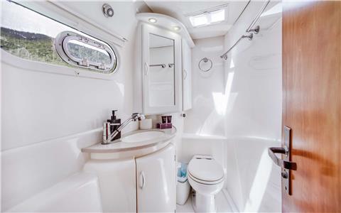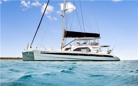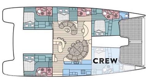 Foredeck features large deck space and trampolines with built in back rests. Cabins are large and comfortable, with more than ample storage for clothing and personal effects, and heads feature separate shower stalls.