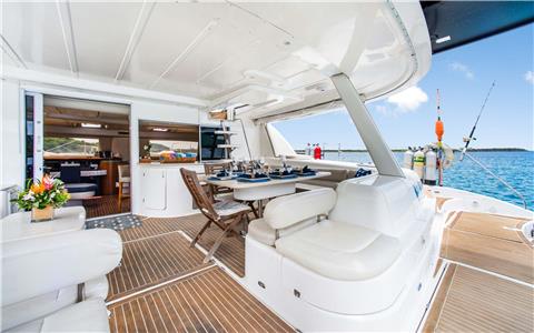 Flybridge accessed by stairs in the cockpit lead to a large lounge area with cushioned mats, beanbags, and a table for 4 for coffee or cocktails.