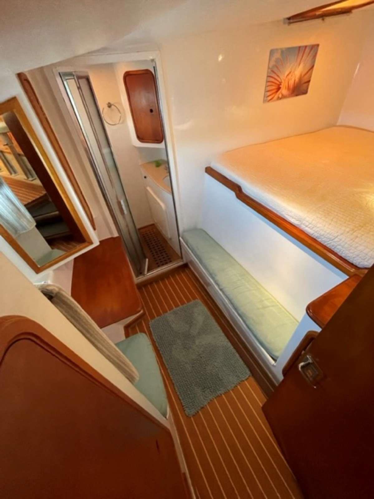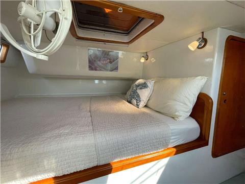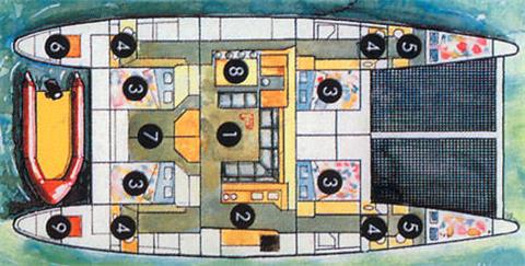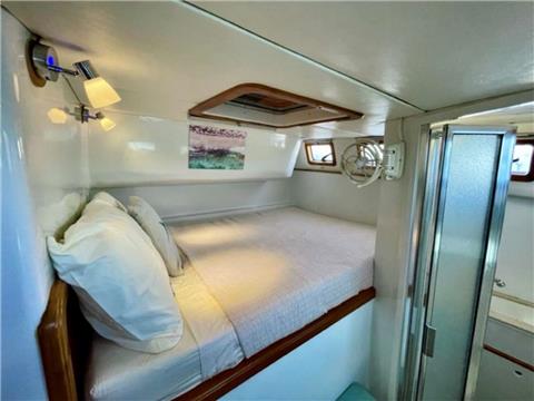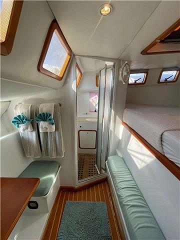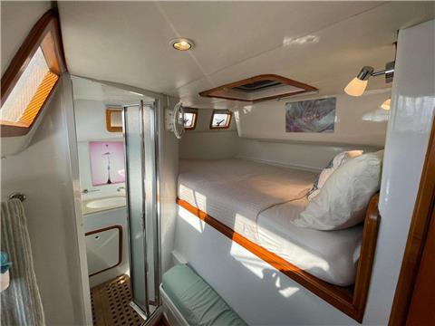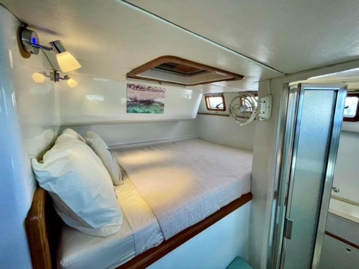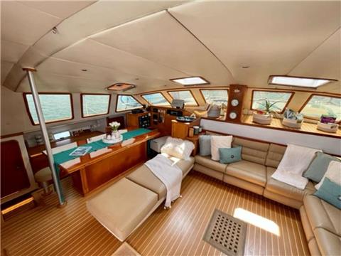 3 queen guest cabins each with ensuite electric head, wet shower and sink. "Spacious salon with bar, aft cockpit and forward trampolines"