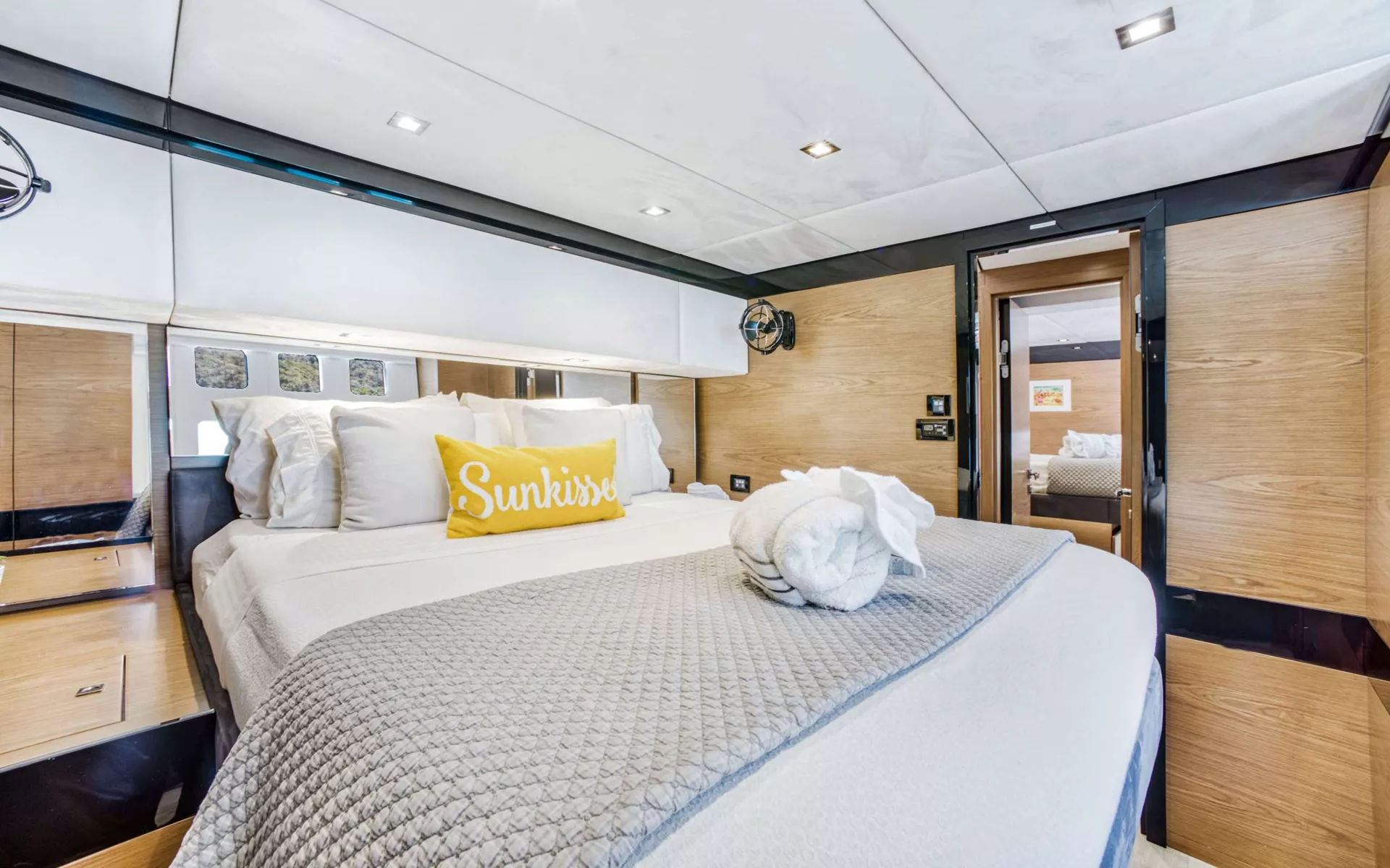 1 Master queen cabin with extra large bath including walk-in large shower, individual a/c control etc. 2 queen cabins each with individual a/c control, private ensuite electric head and stall shower.