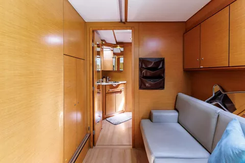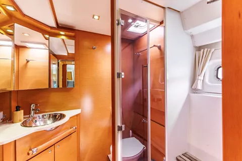 Two guest cabins with queen size berths. The Primary Cabin has a separate shower stall.