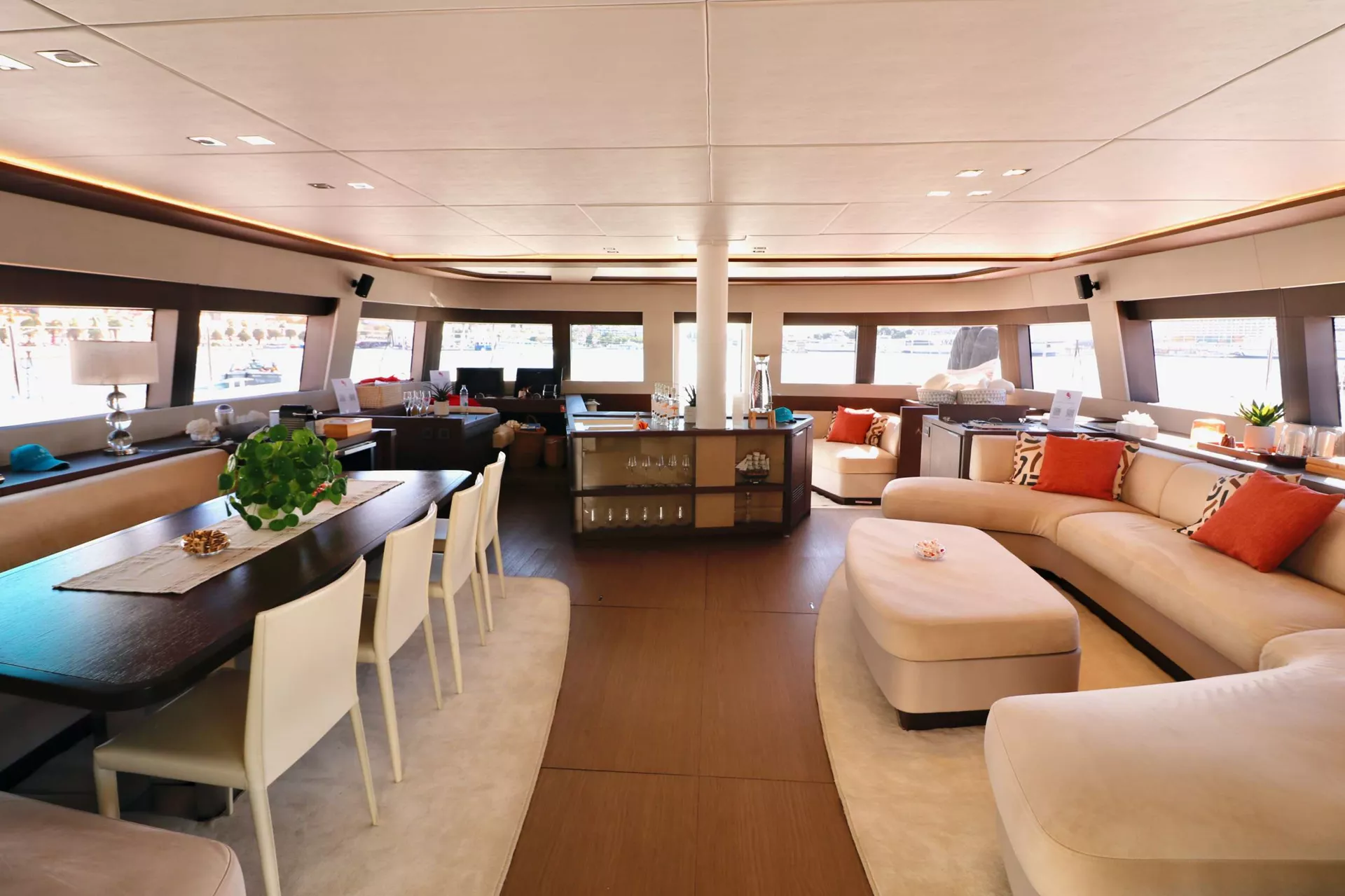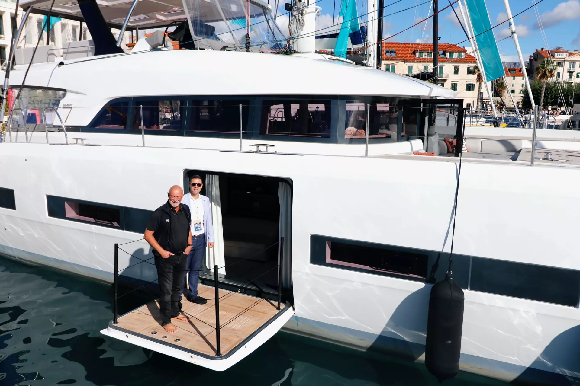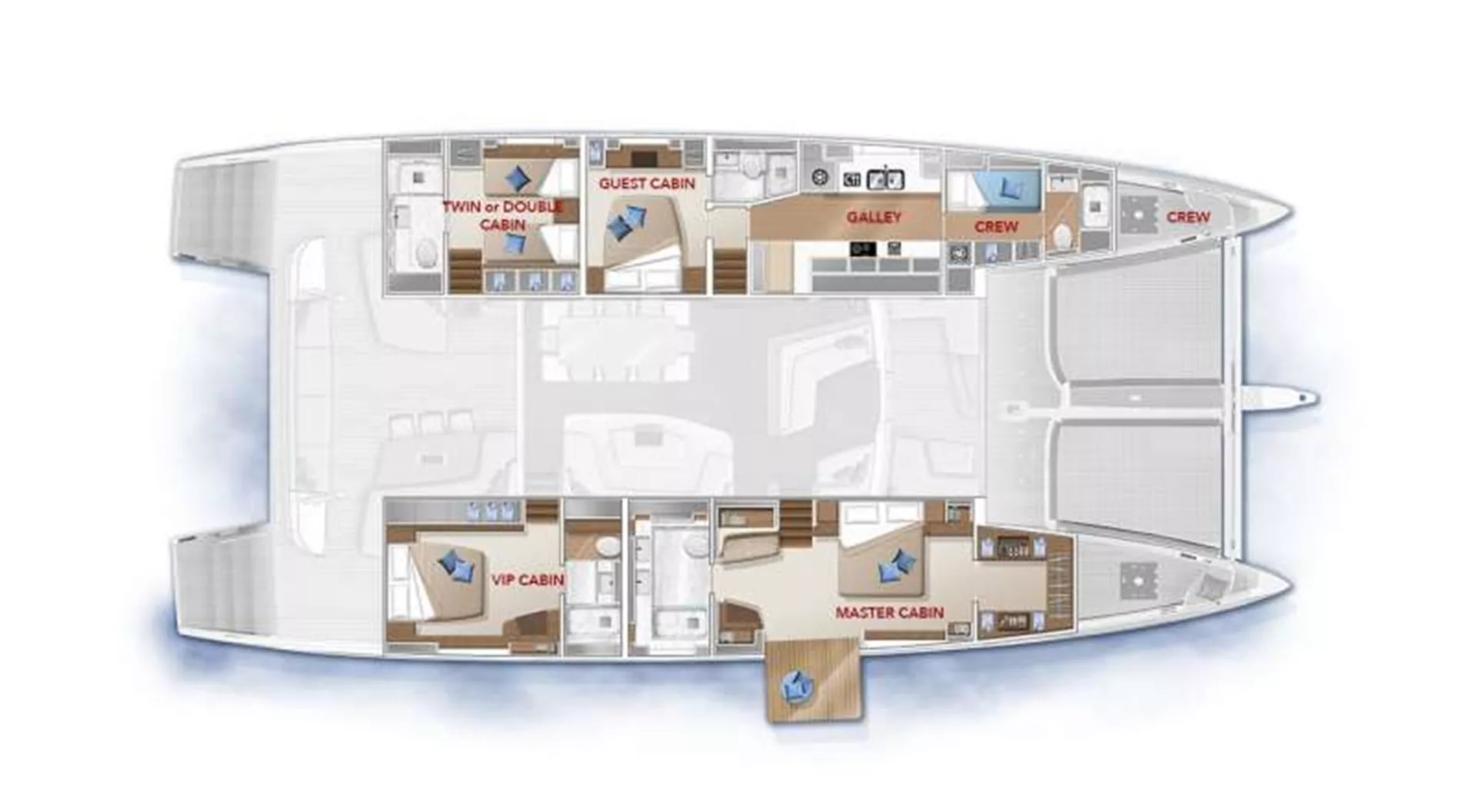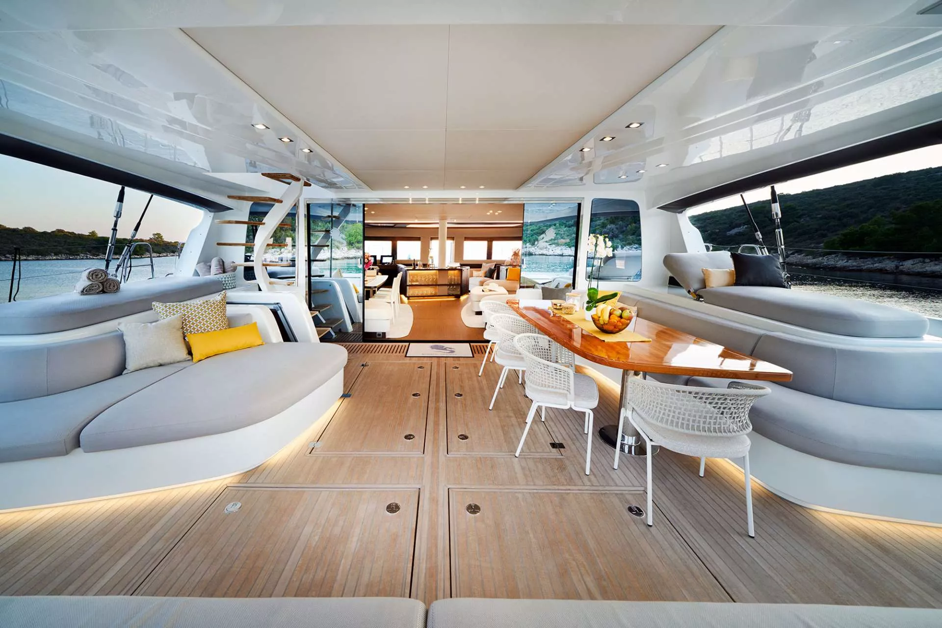 The Private Master Balcony: A Lagoon 77 signature, the hydraulic hull door in the master suite opens to a private teak balcony, offering unparalleled, direct-to-sea access—a feature utterly unique to a yacht of this class. There are 2 more VIP double and 1 twin (convertible), all en-suite and fully serviced.