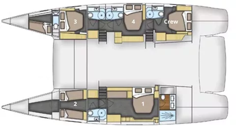 True Story has 4 cabins - 1 Port Midship Primary Suite King, Port Fwd King (that can be converted into 2 twin beds) & 2 Queens STBD side.