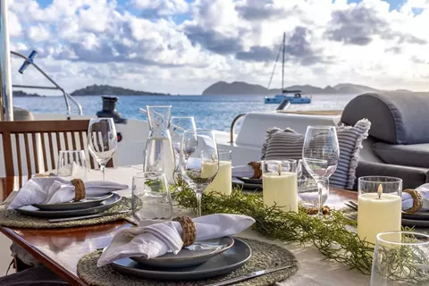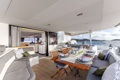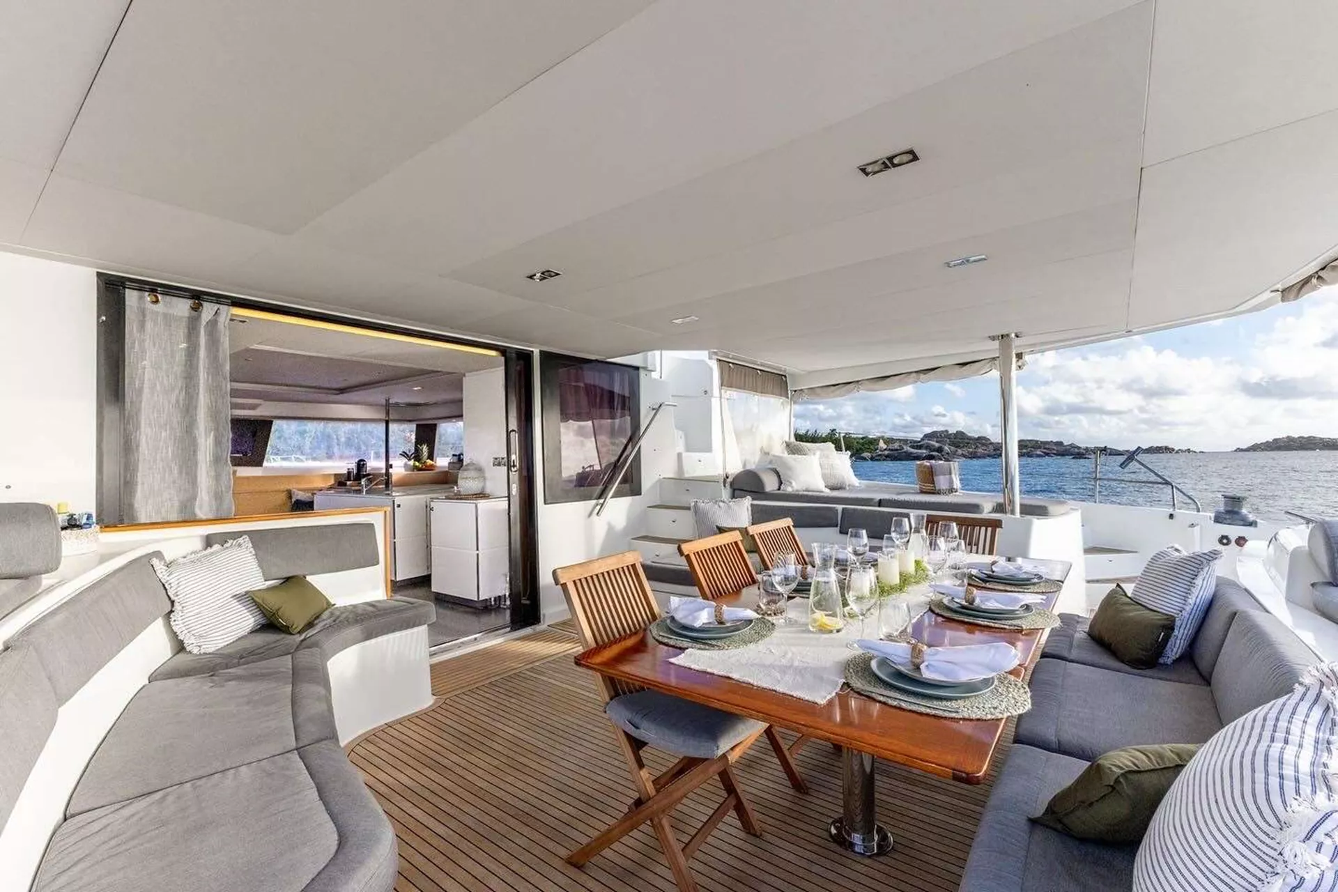 A step through the glass doors into the salon reveals a spacious and comfortable area to entertain, or just relax in air-conditioned comfort if so desired. The open galley is equipped with state-of-the-art appliances and kitchenware and the crew is always on hand to provide top quality service.