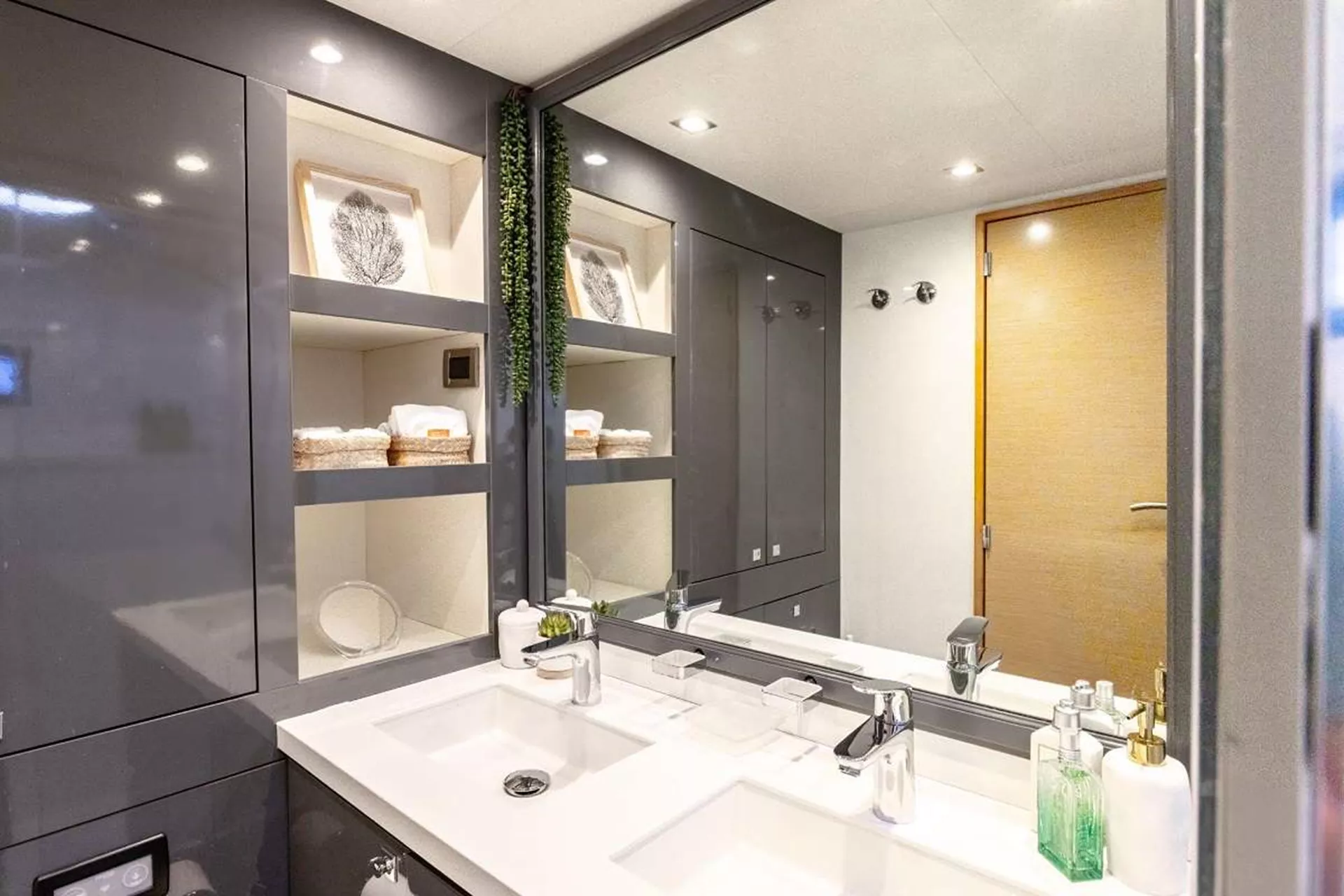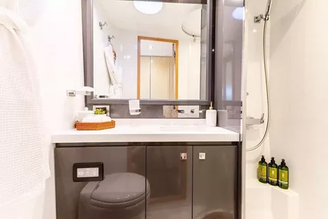 True Story hosts up to 8 guests - 2 Kings - 1 primary suite and other king can be converted to 2 twin beds, 2 queens, air-conditioned cabins. Each cabin has its own, private ensuite bathroom with a separate shower. The primary suite is elegant and roomy and includes seating/lounge area, a desk, and king size berth and the ensuite bathroom has a separate large glass shower stall and double vanity.
